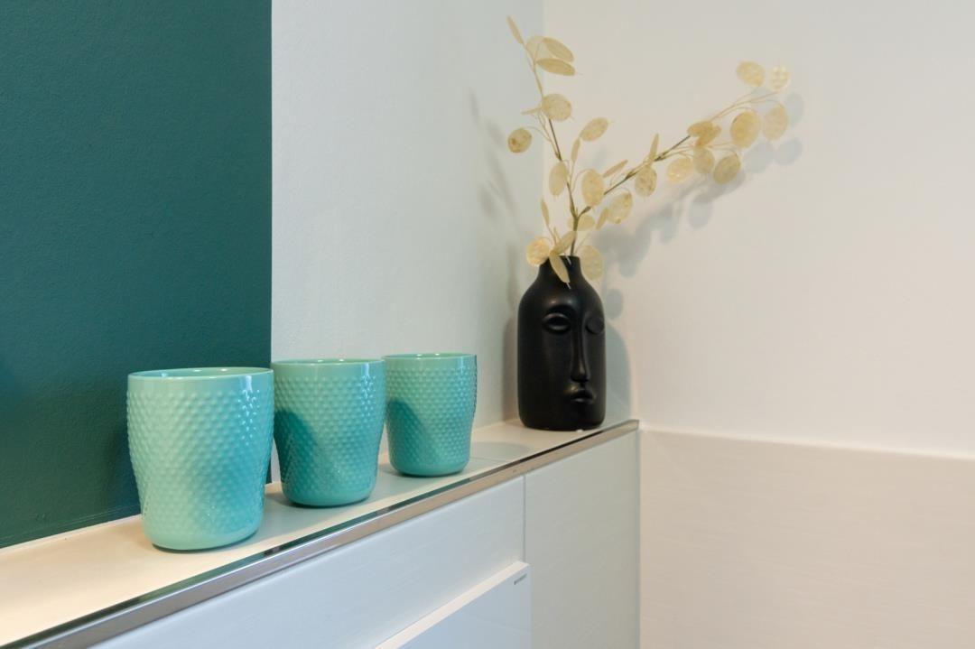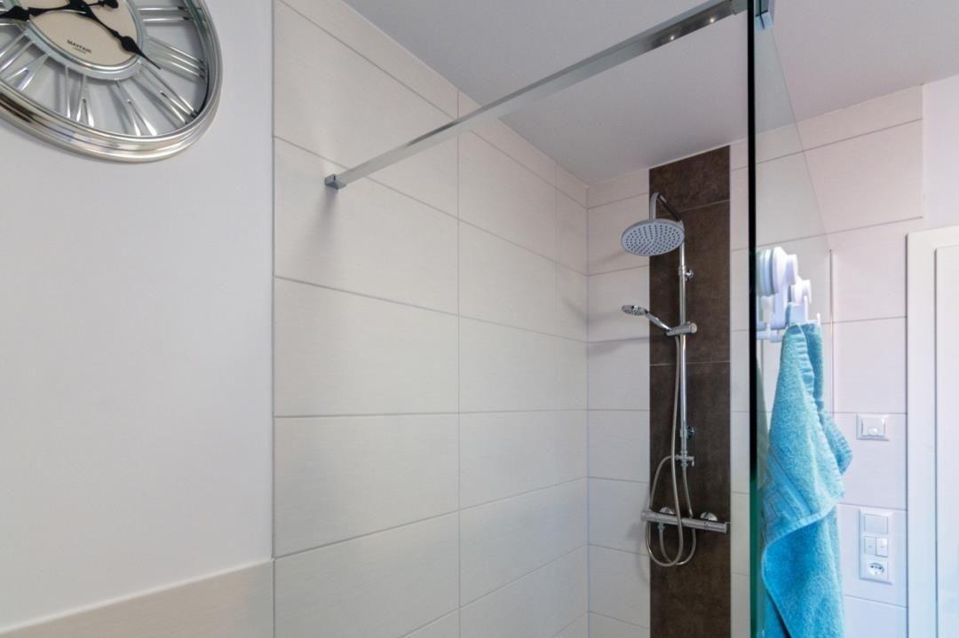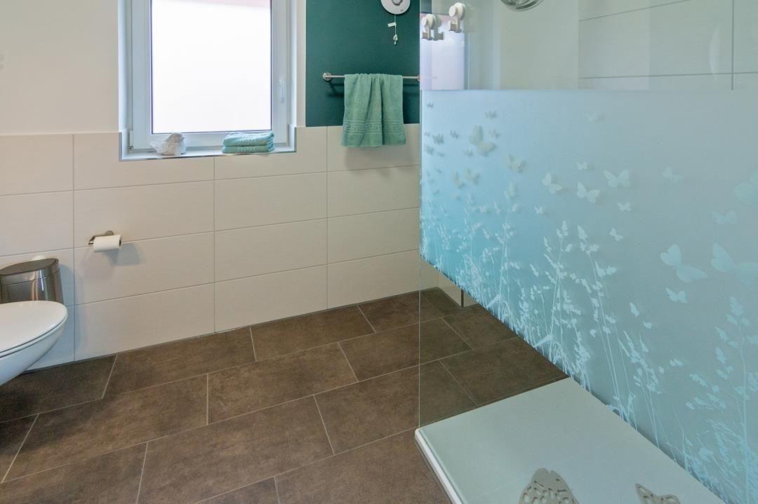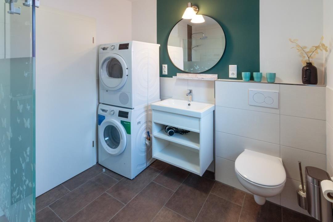 Ein echtes Highlight ist das moderne Badezimmer mit seinen schicken weiß-dunkelbraunen Fliesen. Es ist äußerst großzügig und mit dem großen Fenster auch angenehm hell. Die ebenerdige Dusche bietet Ihnen viel Platz. Außerdem stehen Ihnen im Badezimmer eine Waschmaschine und ein praktischer Trockner zur Verfügung. Einen Haartrockner finden Sie im Badezimmerschränkchen unter dem Spiegel.