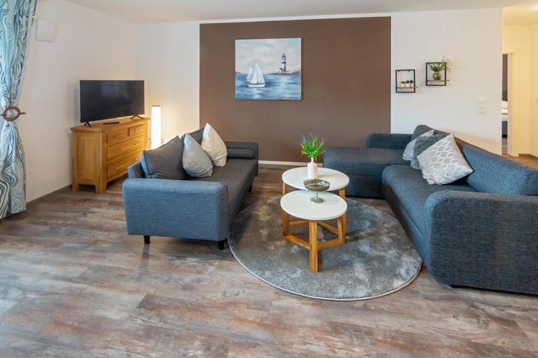 Im Wohnbereich erwartet Sie eine gemütliche Couch sowie ein modernes TV-Gerät für gemütliche Abende. Wollen Sie bei schönem Wetter noch etwas draußen sitzen, können Sie dieses auf dem kleinen Treppenvorsprung vor der Eingangstür tun. Zu diesem Zweck stehen ein kleiner Tisch und zwei Stühle für Sie bereit.