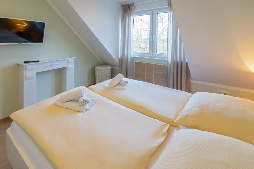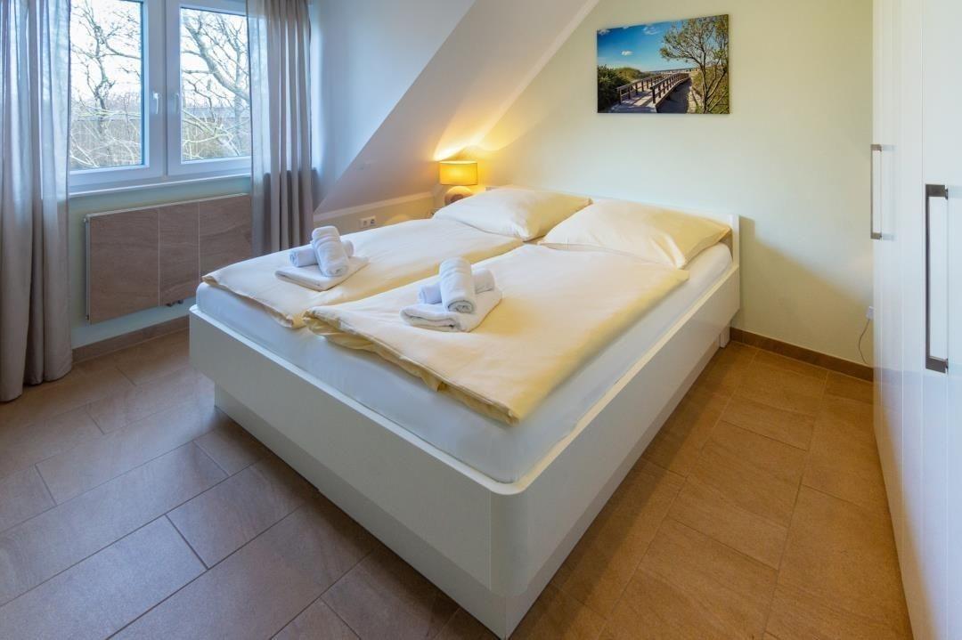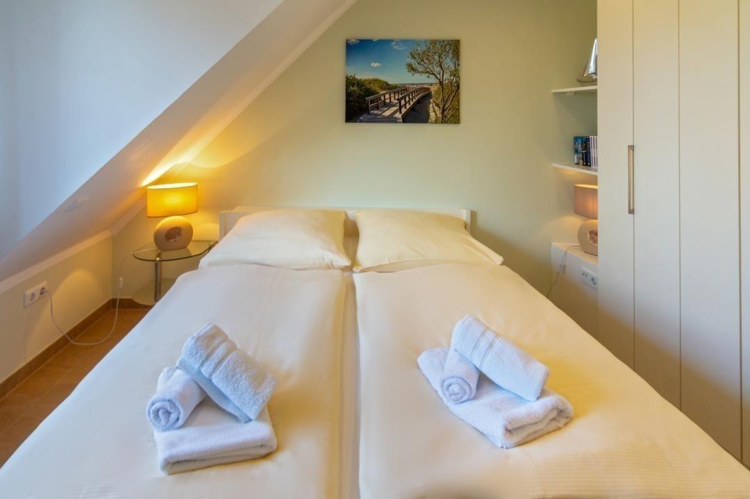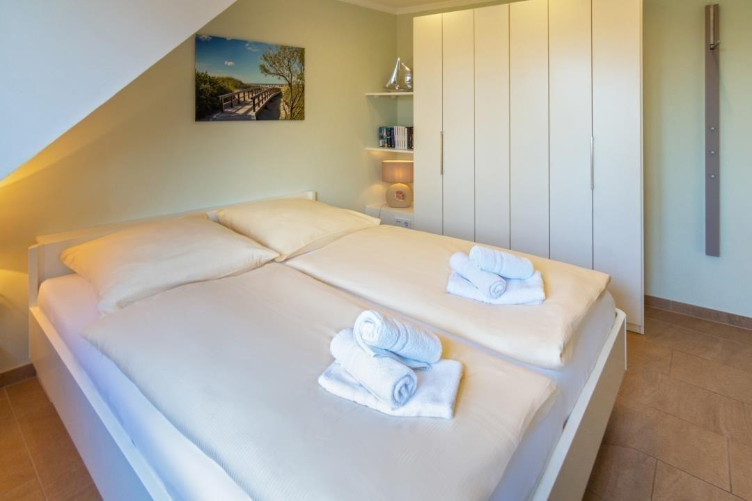Das Schlafzimmer, mit einem herrlichen Blick auf die Fähren, ist mit einem komfortablen Doppelbett (160 x 200 cm) inklusive verstellbarem Lattenrost, einem geräumigen Kleiderschrank sowie einem Fernseher mit integriertem DVD-Player ausgestattet. Ab 2024 erwarten Sie hier neue Matratzen, Kissen und Bettdecken für einen erholsamen Schlaf.