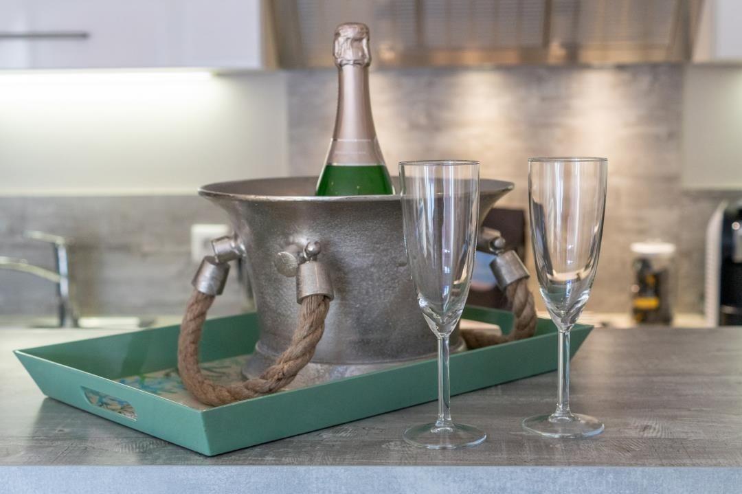 Das Herzstück dieser Wohnung mit ihrem maritimen Flair ist der offene Wohn-/Essbereich. Hier erwartet Sie eine moderne, voll ausgestattete Küchenzeile mit Cerankochfeld, Backofen, Geschirrspüler, Kühlschrank/Gefrierfach, Mikrowelle, Kaffee-/Espressomaschine, Wasserkocher und Toaster. Ein langer Tresen mit Hochstühlen grenzt den Kochbereich ab und lädt dazu ein, die zubereiteten Köstlichkeiten ganz leger zu genießen. Dahinter schließt sich ein gemütlicher Wohnbereich mit eleganter Ledergarnitur, Fernseher und HiFi-Soundsystem an. Zur Begrüßung stehen Sekt und Espressokapseln gratis zur Verfügung!