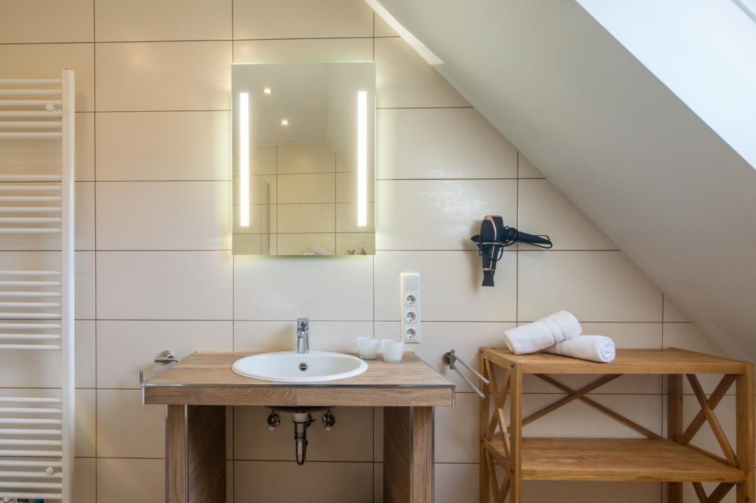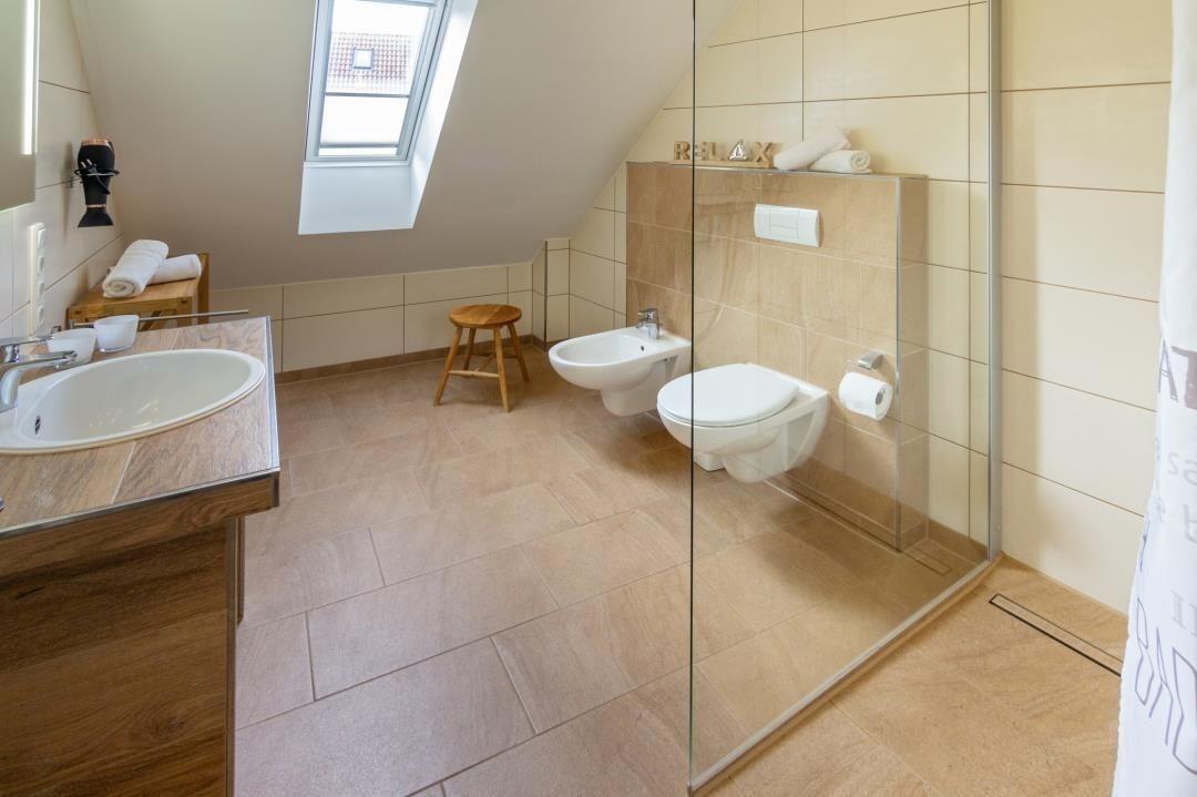 Im modernen Tageslichtbad finden Sie eine großzügige, ebenerdige Glasdusche, einen stilvollen Waschtisch, WC, Bidet, Handtuchwärmer und Fön.