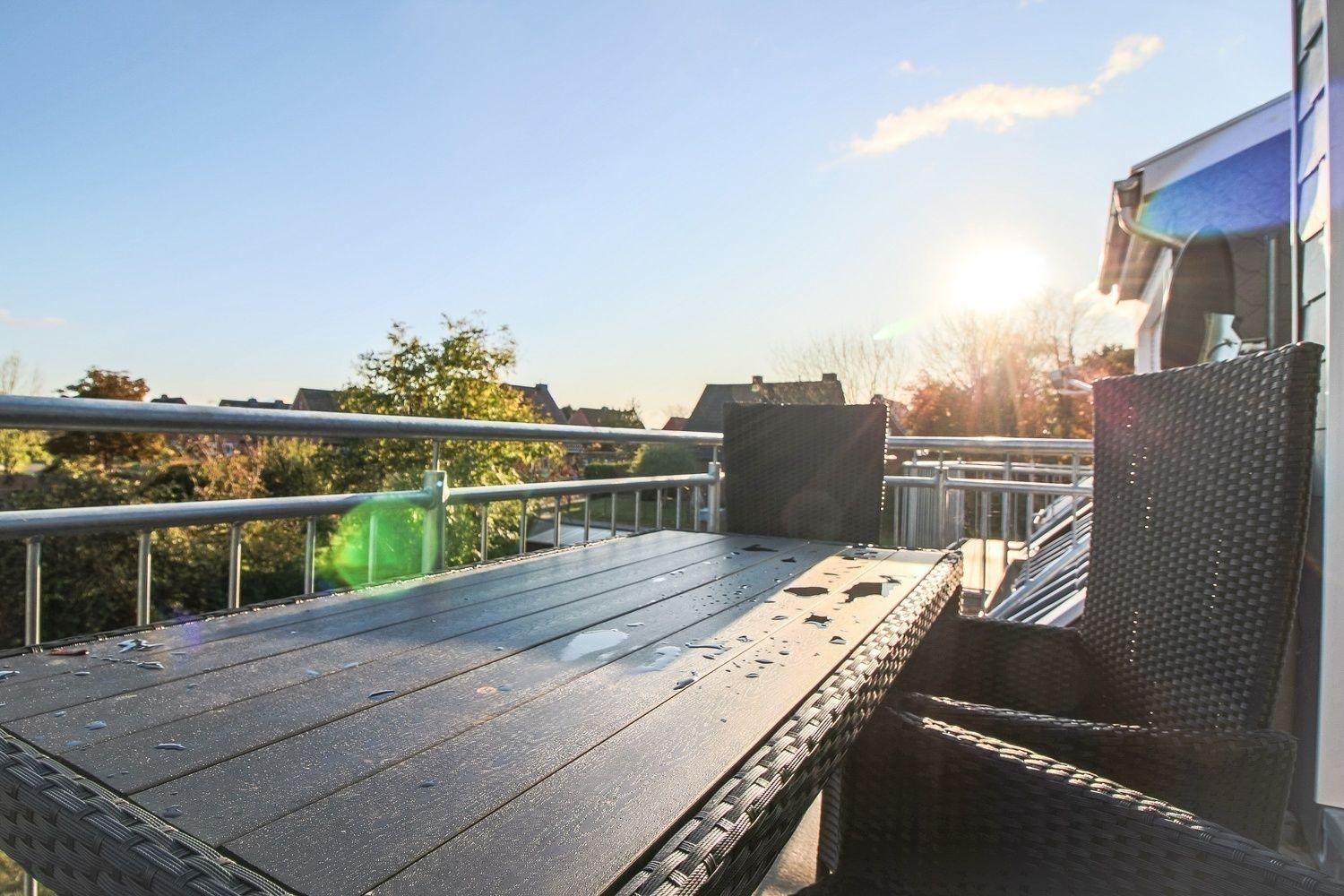 Im Außenbereich befindet sich der sonnige Balkon mit Gartenmöbeln.