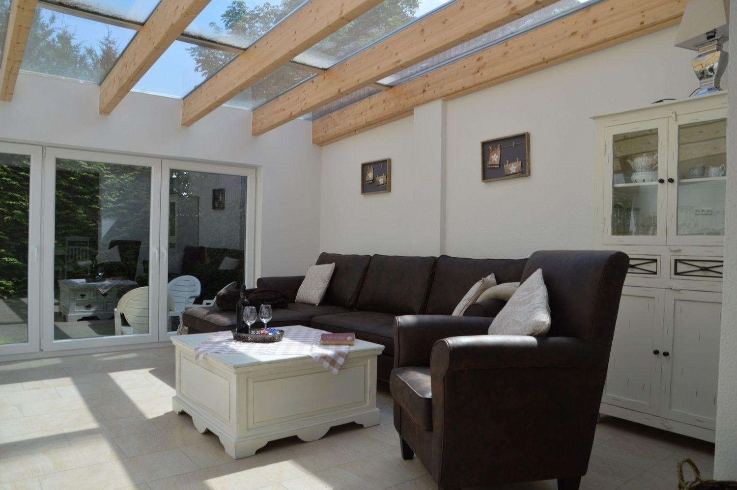 In warmen Naturtönen gehalten lädt der Wohnraum mit angrenzendem großen Wintergarten zum Verweilen ein. Von der bequemen Wohnlandschaft mit Sessel im Wintergarten können Sie in den Garten sehen, den Flammen im Kamin zusehen oder auch fernsehen. Der angrenzende Esstisch mit Stühlen ist nicht nur für gediegende Mahlzeiten bestens geeignet sondern auch für spannende Spieleabende.