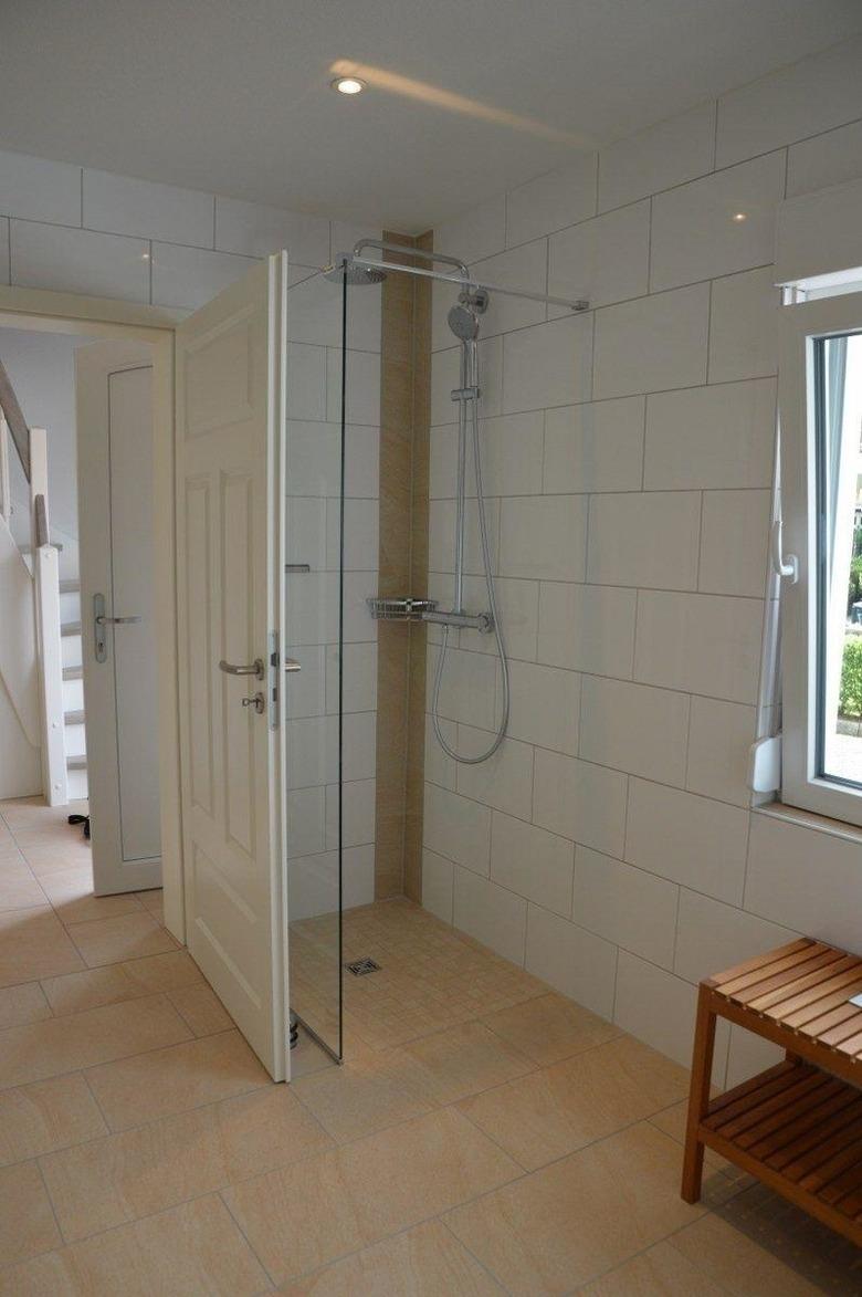 Das Badezimmer im Erdgeschoss beherbergt eine bodentiefe Dusche, Waschbecken mit Unterschrank, Fön, WC, Handtuchwärmer und eine Waschmaschine.