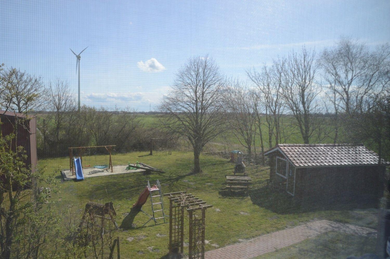 Von der Terrasse mit Gartenmöbel haben Sie einen tollen Blick auf den Spielplatz sowie über die Felder.