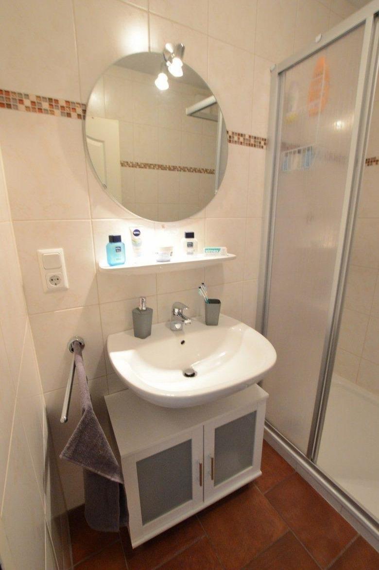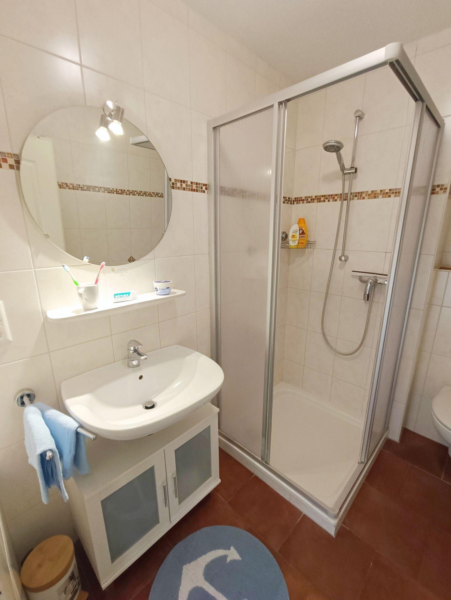 Das Badezimmer mit Dusche, Handtuchwärmer, Waschbecken, Unterschrank und WC befindet sich ebenfalls im Obergeschoss.