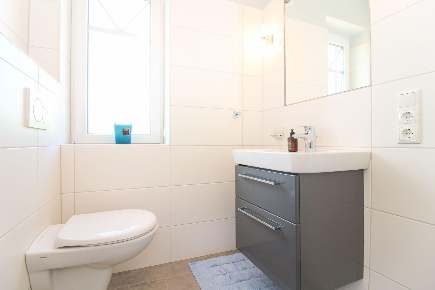 Das Tageslichtbad bietet Ihnen eine bodentiefe Dusche, WC, Waschbecken und Handtucherwärmung.