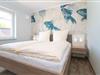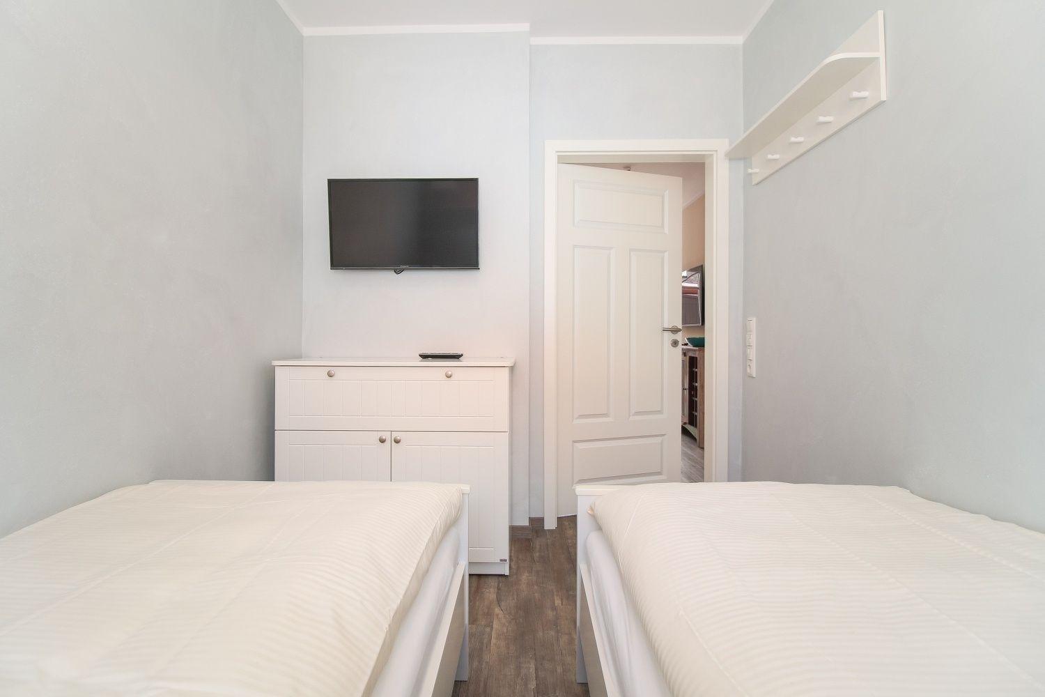 Die ca. 59 m² große Erdgeschosswohnung bietet Ihnen zwei Schlafräume mit Doppel- und Einzelbetten. Der offene Wohnbereich teilt sich seinen Platz mit einer voll ausgestatteten Einbauküche samt Essbereich mit Stühlen.