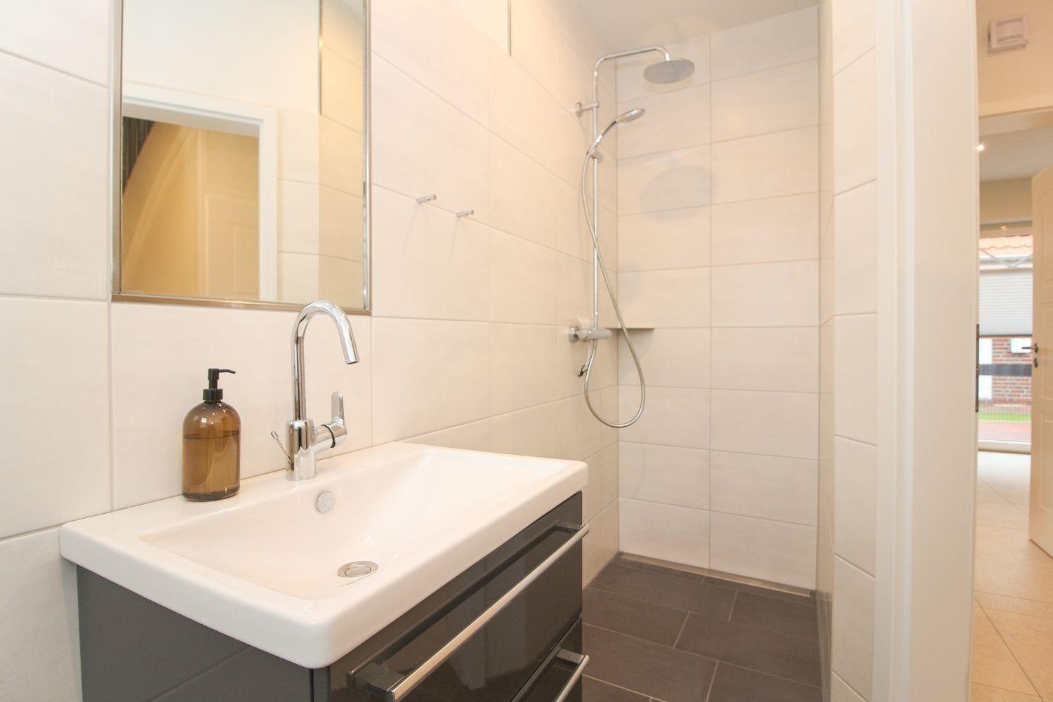 Das Bad ist mit einem WC, Waschtisch, Handtucherwärmung und einer ebenerdigen Dusche ausgestattet.