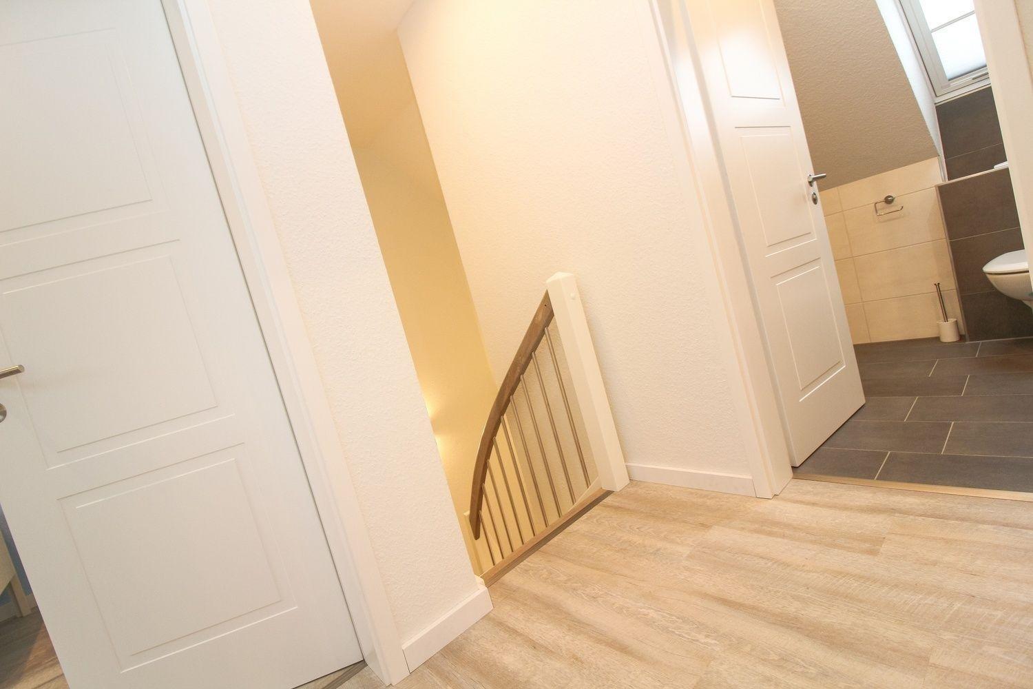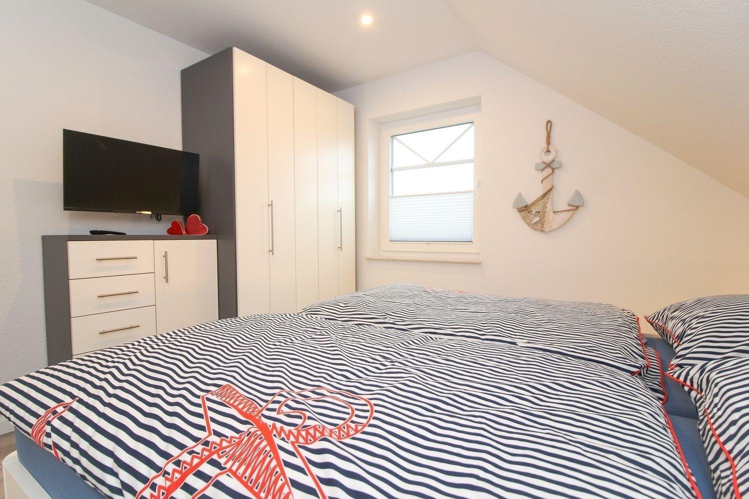 Im Obergeschoß befinden sich ein Schlafzimmer mit Doppelbett, ein Schlafzimmer mit zwei Einzelbetten und ein Gästezimmer mit ausklappbare Schlafcouch für zwei Personen (Maße 150 x 200m).
