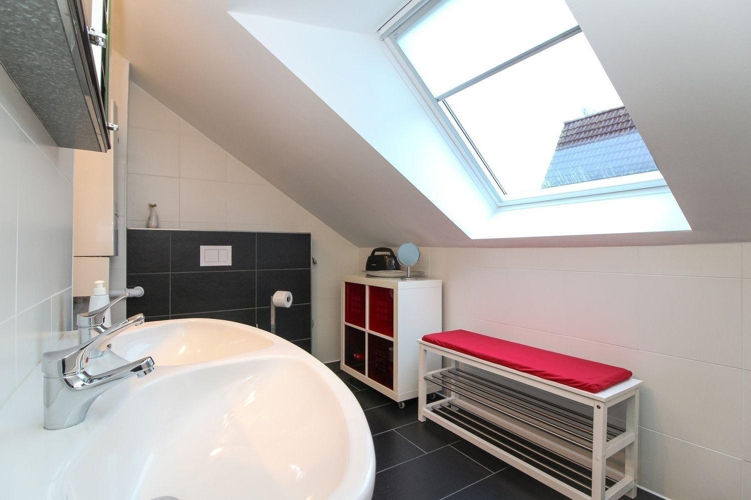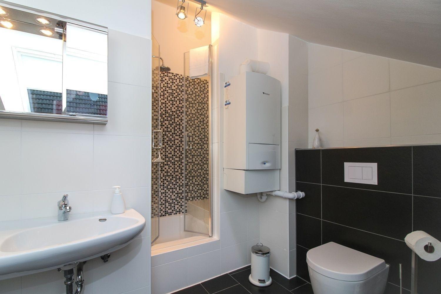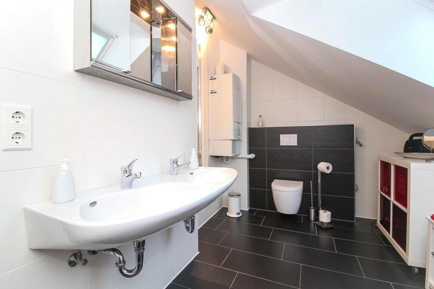 Es hat ein modernes Tageslichtbadezimmer mit Dusche, Doppelhandwaschbecken und WC.