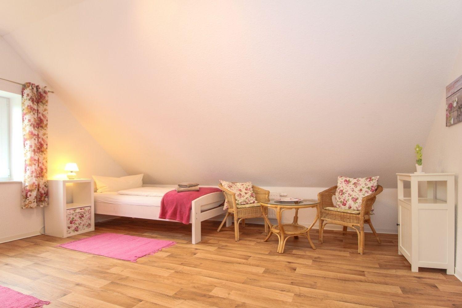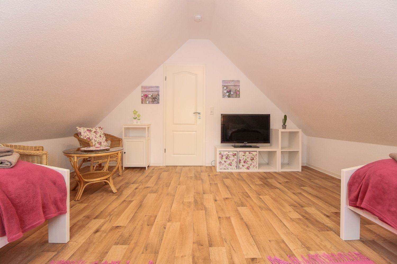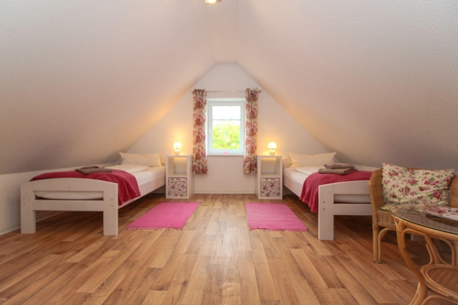Über die Treppe im Wohnbereich erreichen Sie das Obergeschoss der Wohnung. Hier stehen Ihnen zwei Einzelbetten zur Verfügung.