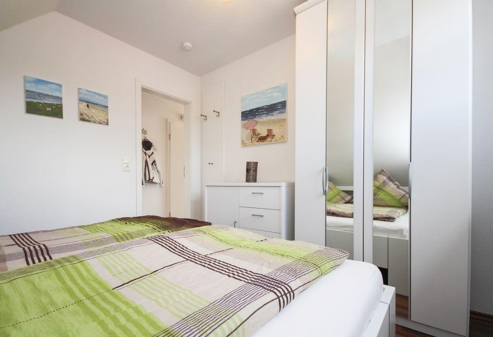 Im 1,80x2,00m großen Bett mit offenem Fußteil werden Sie bestimmt süß träumen. Desweiteren gibt es im Elternschlafzimmer zwei Nachtkonsolen, einen Kleiderschrank, eine Kommode sowie ein Radiowecker.