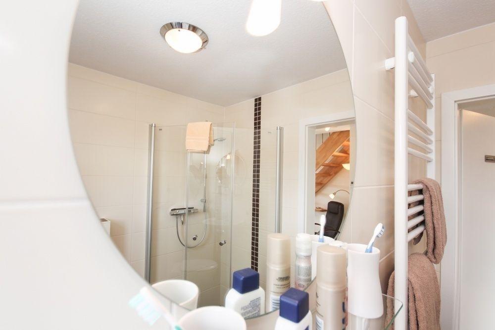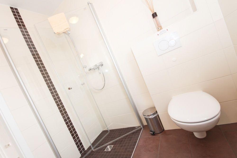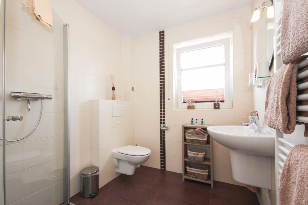 Das Tageslichtbad mit bodentiefer Dusche, Waschbecken, WC, Fön, Handtuchwärmer und Fußbodenerwärmung vertreibt Ihnen die Morgenmüdigkeit.