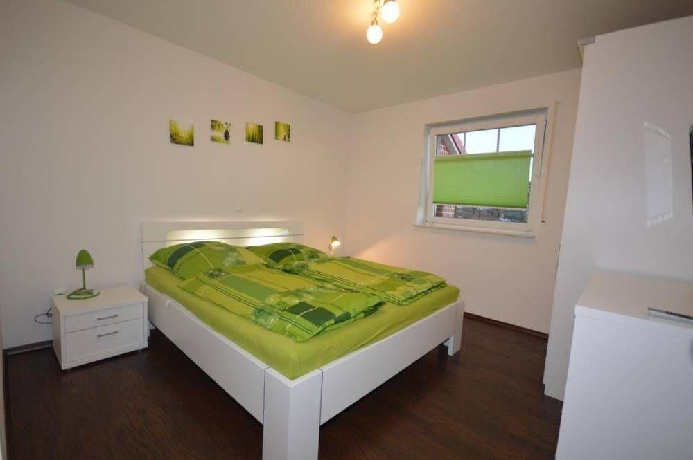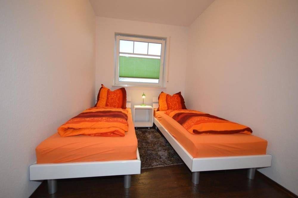 Im ersten Schlafzimmer befinden sich ein Kleiderschrank, ein Doppelbett (1,80 m x 2,00 m) sowie eine Kommode. Das zweite Schlafzimmer beinhaltet zwei Einzelbetten (0,80 m x 2,00m) und eine Kommode. In beiden Schlafräumen befinden sich außerdem Nachttische und TV-Geräte. Das helle Bad in modernen Farbtönen mit ebenerdiger Dusche mit Schwallschutz vertreibt die Morgenmüdigkeit.Das ganze Haus lässt sich mit einer Fußbodenheizung beheizen. Der Außenbereich verfügt über eine eigene Terrasse mit Gartenmöbeln und ein Außenabstellraum (Gartenhütte), in dem sie Ihre Fahrräder unterstellen können. Zum Haus gehört ein PKW-Einstellparkplatz.