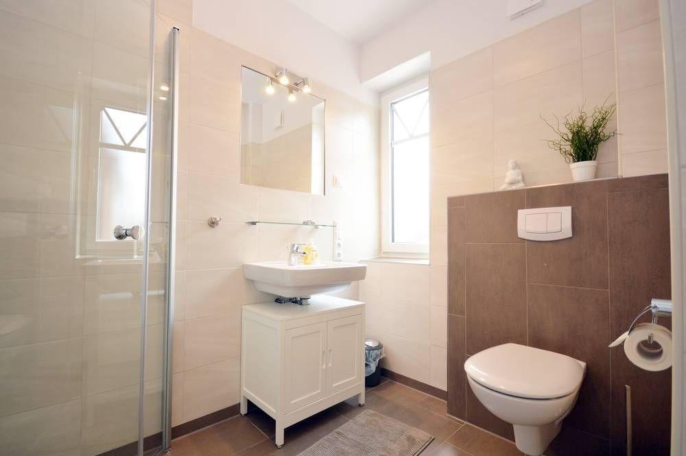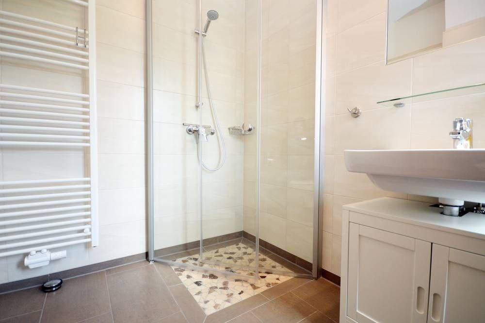 Das Tageslicht-Bad ist mit einer ebenerdigen Dusche und einem Handtuchwärmer ausgestattet.
