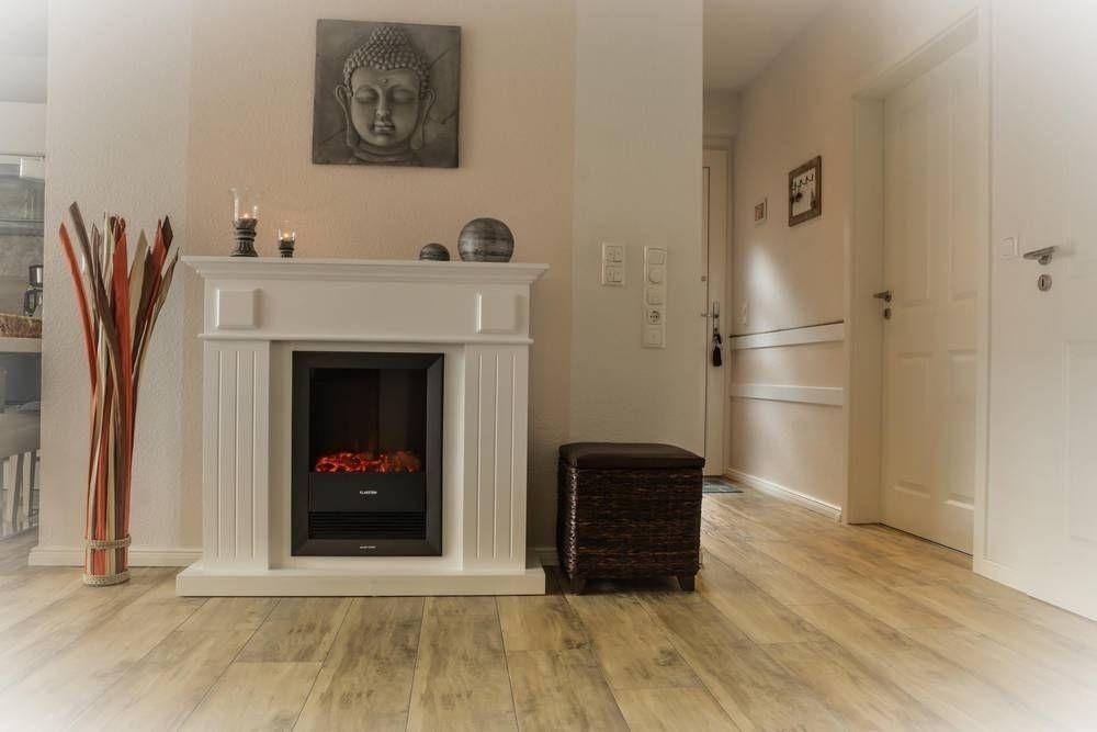 Dem Eingangsbereich mit Nischengarderobe schließt sich der große helle Wohnbereich an. Eine gemütliche Sofa-Ecke mit Couchtisch, einen großem Flachbildschirm-TV, Blue-Ray-Player und Hifi-Anlage laden zum Verweilen ein. Ein zusätzlicher Blickfang ist der Elektro-Kamin.
