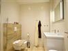 Das geschmackvoll geflieste Bad ist ebenfalls sehr hochwertig ausgestattet und verfügt über ein WC, einen Waschtisch mit geräumigem Unterschrank, einen beleuchteten Spiegel und einer großzügigen barrierefreien Dusche mit Glas-Trennwand; ein Fön, ein Kosmetikspiegel und ein Erste-Hilfe-Set sind vorhanden.