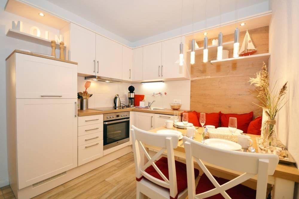Die gemütliche Küchenecke bietet mit einem Geschirrspüler, einem Backofen, einem Ceran-Kochfeld, einer Mikrowelle und einem Kühlschrank mit Eisfach modernen Komfort. Diverse Küchengeräte (z.B. Kaffeemaschine, Wasserkocher, Toaster, Eierkocher, Mixer, Heißer Stein) stehen neben einer umfassenden Küchenausstattung selbstverständlich zur Verfügung. Der Esstisch wird von einer urigen Truhenbank und zwei einzelnen Stühlen eingerahmt. Für unsere jüngsten Gäste wird auf Anfrage gern ein Baby-Hochstuhl bereitgestellt.