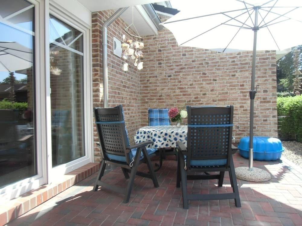 Die geräumige Terrasse ist mit bequemen Gartenmöbeln und einem Sonnenschirm ausgestattet. Für gemütliche Grillabende steht ein Elektrogrill zur Verfügung. Von unseren jüngeren Gäste kann in den Sommermonaten eine Kinder-Planschmuschel genutzt werden. Da der Terrassen- bzw. der angrenzende Außenbereich fast vollständig umzäunt bzw. von einer kleinen Hecke umgeben ist, kann man hier in Ruhe die Nordseeluft genießen und die Seele baumeln lassen.
