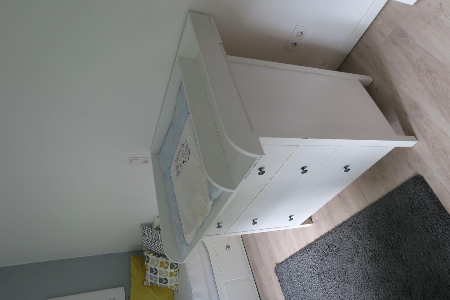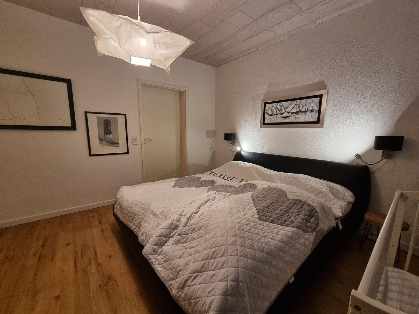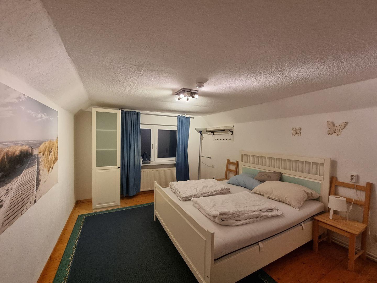 Erdgeschoss: Großes Schlafzimmer mit Doppelbett (180 x 200 cm) und eigenem Ensuite-Bad. Kleines Schlafzimmer mit Hemnes-Tagesbett, das auf 160 x 200 cm erweitert werden kann.