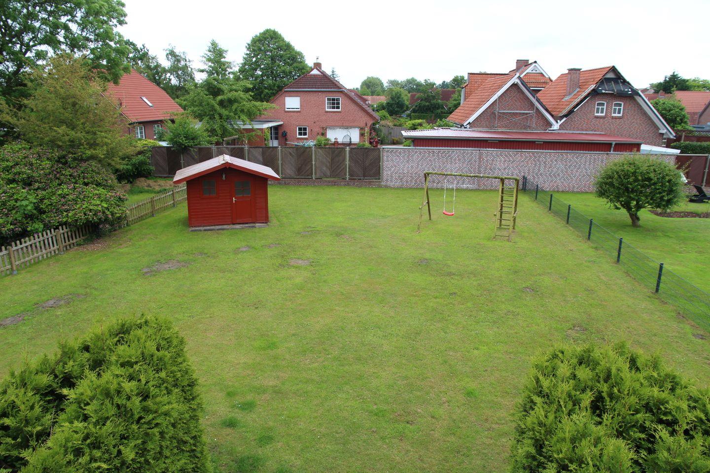 Im Gartenbereich bieten wir eine Terrasse inkl. Sonnenschirm, 6 Stühle, Gartentisch, einen Holzkohlegrill, Gartenhaus, eingezäuntes Grundstück.