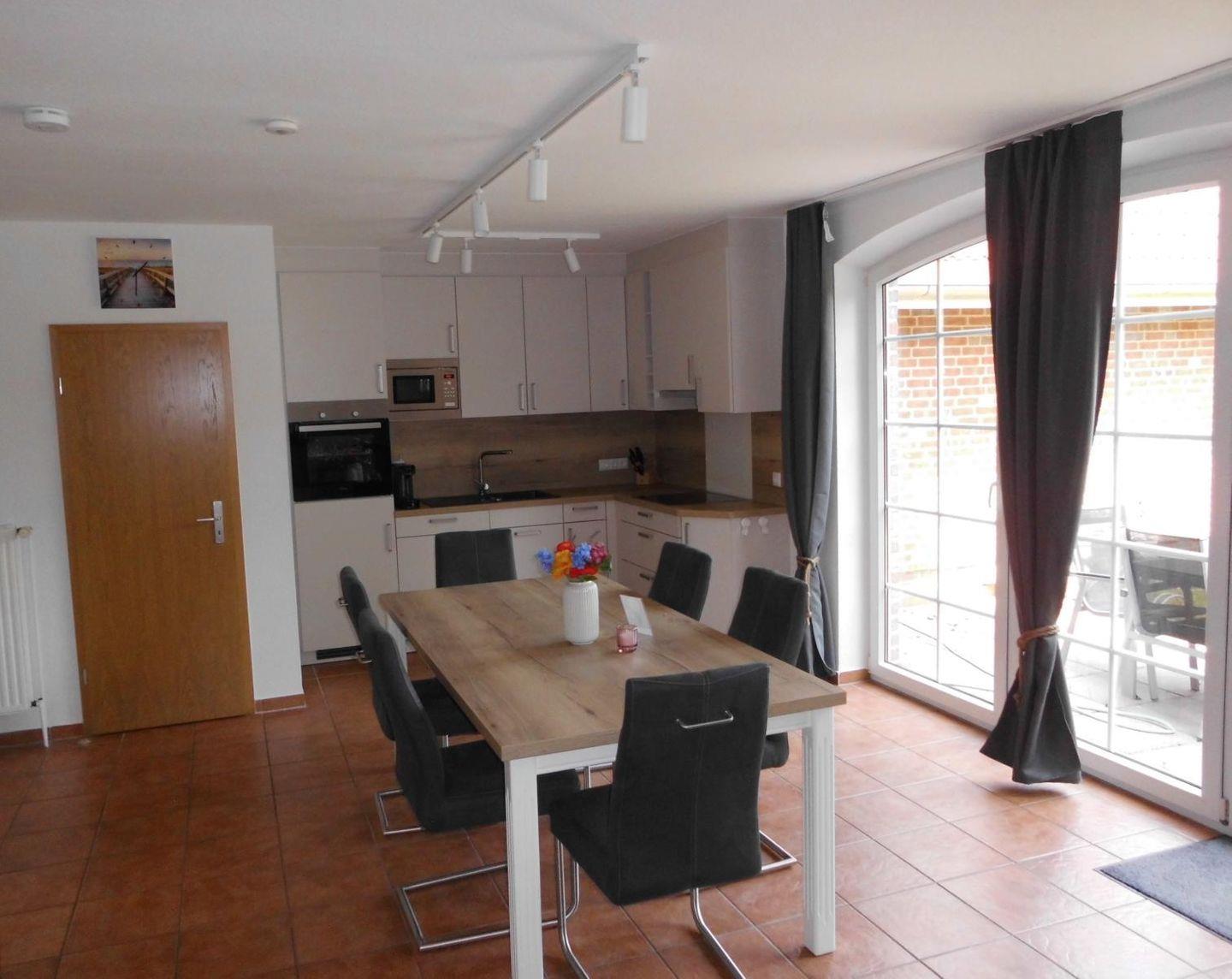 Das Haupthaus für 5 Personen verfügt im Erdgeschoss über ein großes Wohn-/ Esszimmer mit einer komplett ausgestatteten Küche (Herd mit Ceran Kochfeld, Backofen, Kühlschrank mit Gefrierfach, Mikrowelle, Kaffeemaschine, Toaster, Wasserkocher, Kochgeschirr etc.). Im Wohnbereich befindet sich ein Smart-TV.