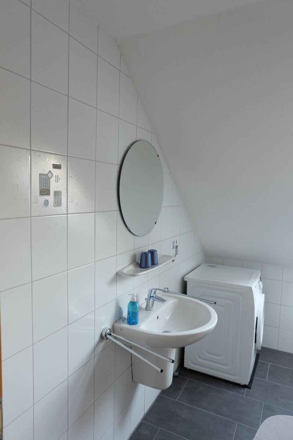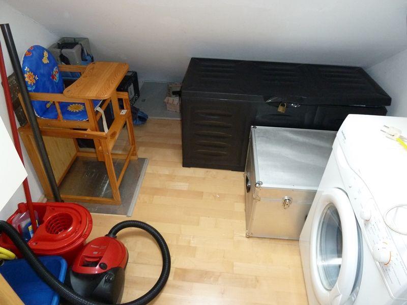 Die Waschmaschine ist im separaten Abstellraum untergebracht. Der Trockner steht im oberen Bad.