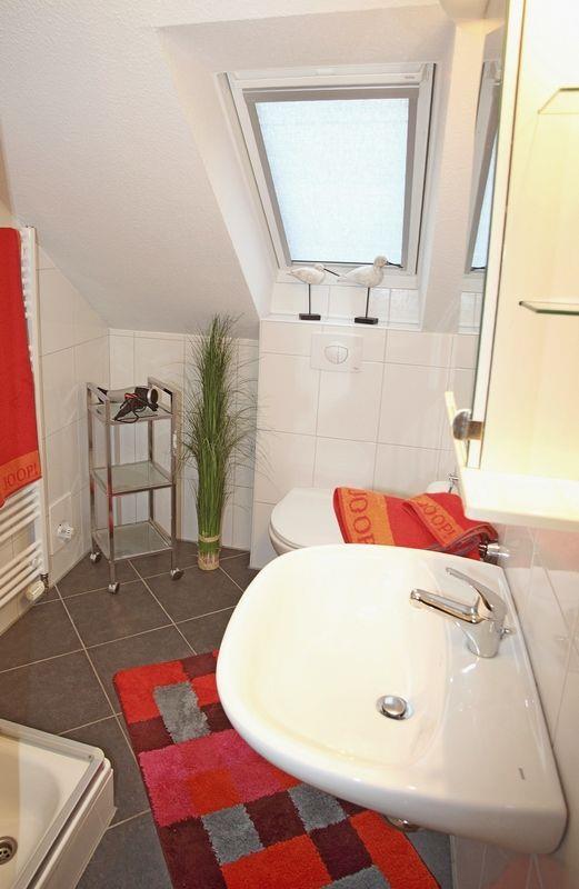 Zusätzlich gibt es im Erdgeschoss ein geräumiges modernes Bad mit extra großer Dusche. Selbstverständlich sind auch eine Waschmaschine, ein Trockner sowie Bügeleisen und Bügelbrett vorhanden. Auch befindet sich in jedem Bad ein Fön.