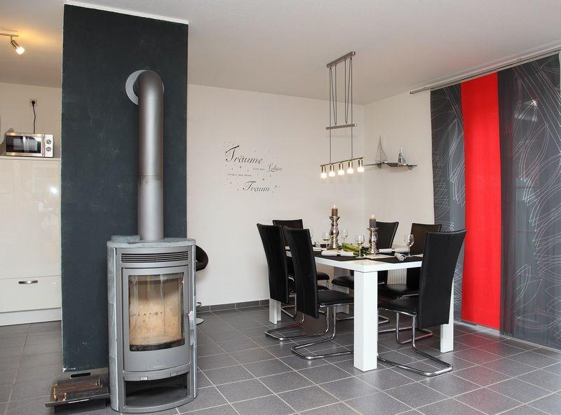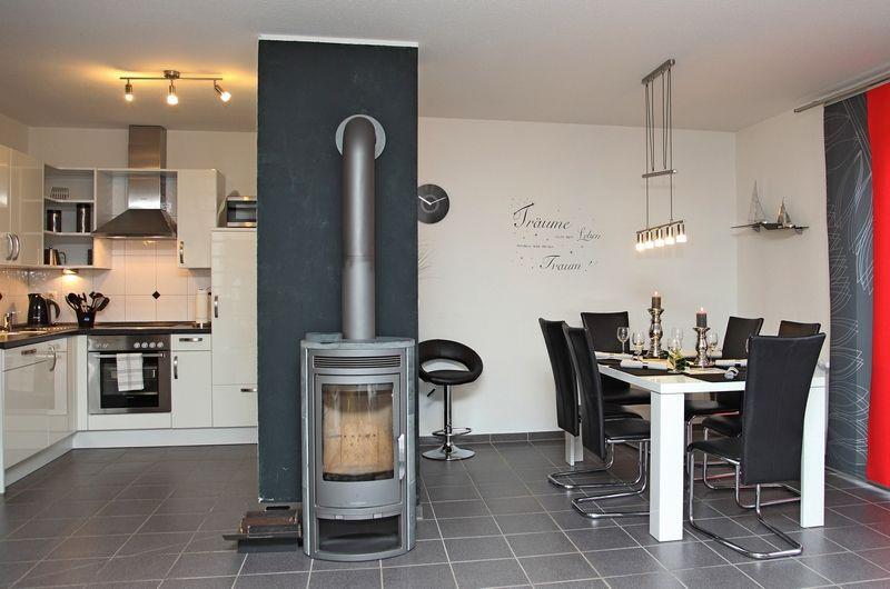Das Erdgeschoss ist bis auf das Schlafzimmer komplett gefliest und zusätzlich im Küchen- und Badbereich mit einer Fußbodenerwärmung ausgestattet. Hier befindet sich auch ein mit Laminat ausgelegtes Schlafzimmer mit Doppelbett sowie der große, offene Wohn-/Essbereich mit gemütlichem Kaminofen für wohlige Wärme, der auch bei kühlerem Wetter einen wunderschönen Urlaub ermöglicht.