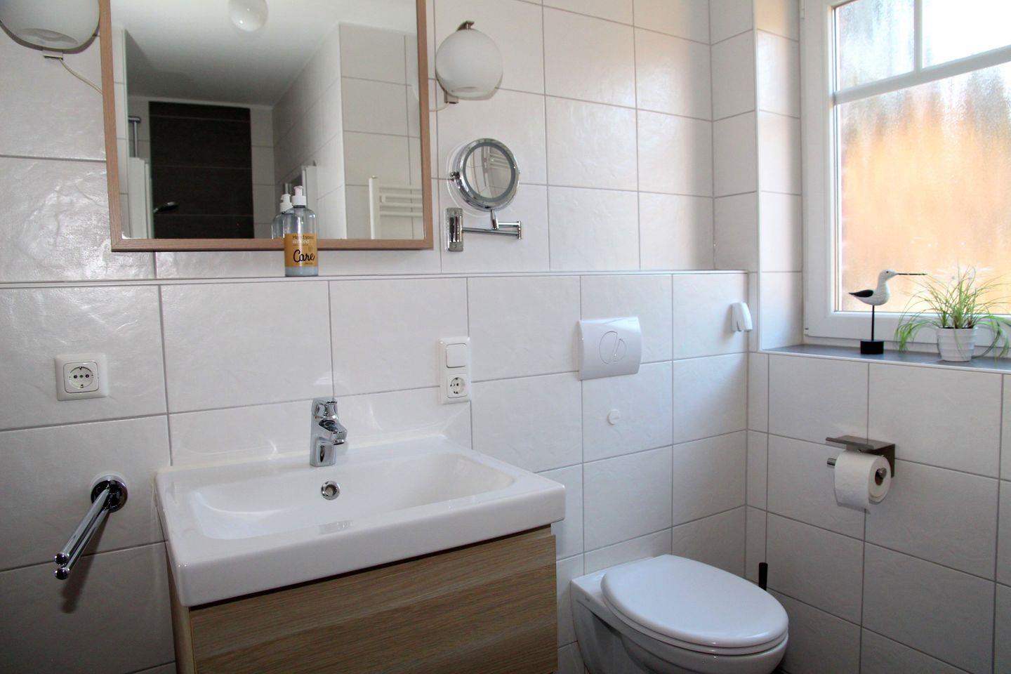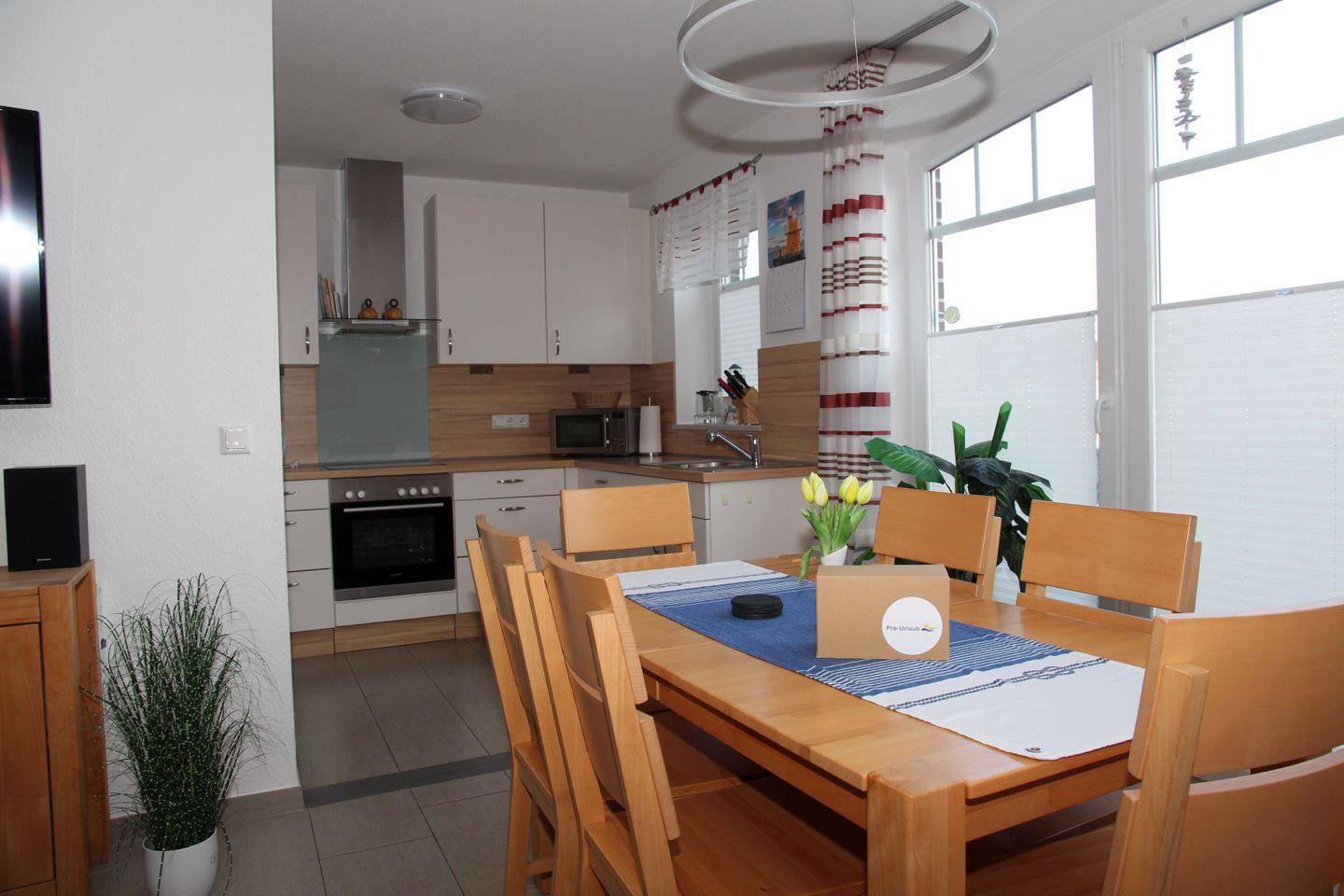 In der vollständig ausgestatteten Küche mit z. B. Geschirrspülmaschine, Mikrowelle, Backofen, großem Kühl- und Gefrierschrank, Kaffeemaschine, Kaffeepadmaschine, Toaster, Mixer, Eierkocher, Wasserkocher u.v.m. bleiben keine Wünsche offen. Selbstverständlich sind eine Waschmaschine und ein Trockner sowie Bügeleisen und Bügelbrett vorhanden. Auch ein Bad mit großer Sauna (Liegen gut 2m lang), Handtuchtrockner und Dusche mit niedrigem Einstieg befindet sich im EG.