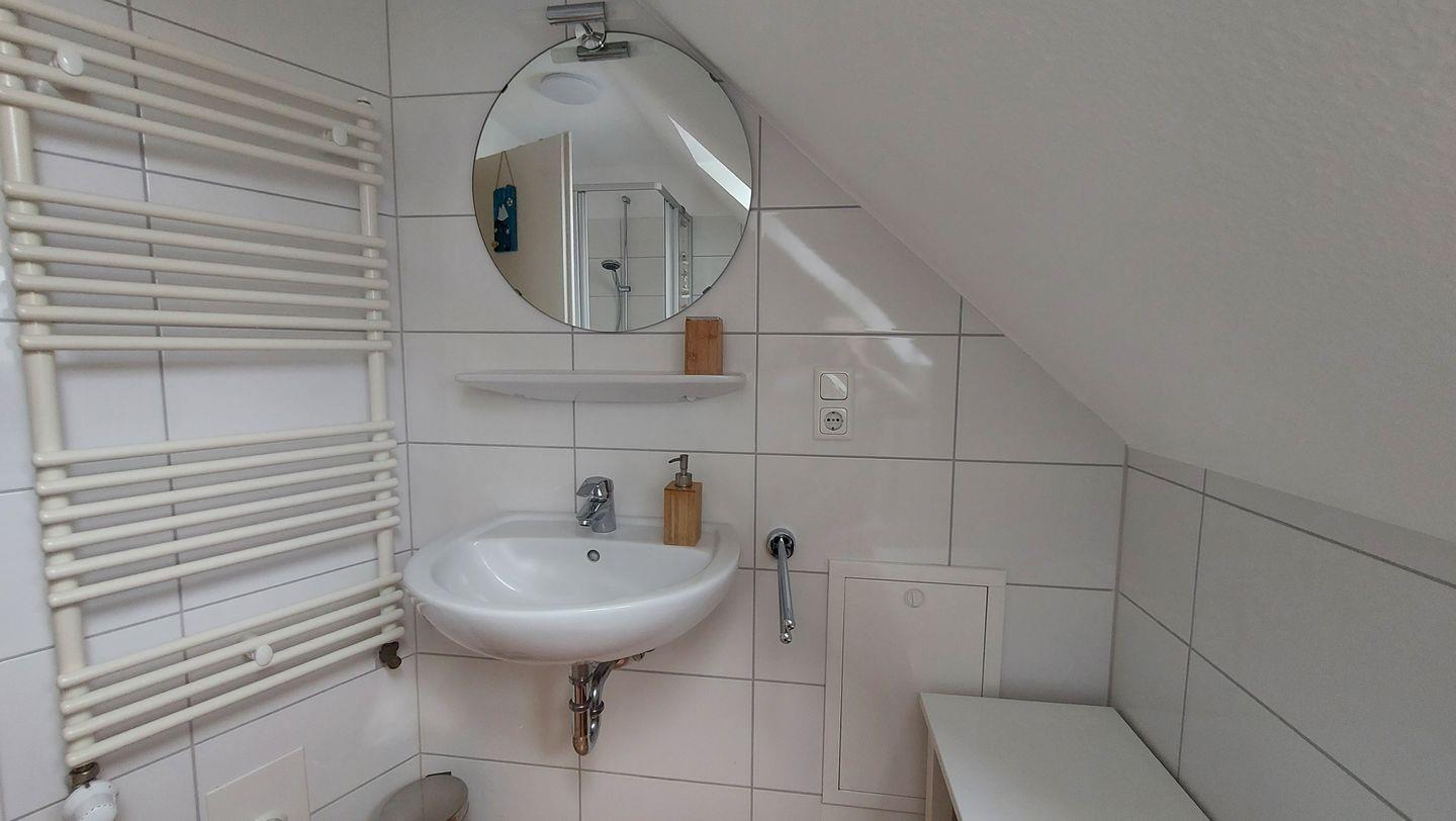 Das Dusch-Bad ist mit einer Fußbodenerwärmung und Handtuchtrockner ausgestattet. Ein Föhn ist vorhanden.