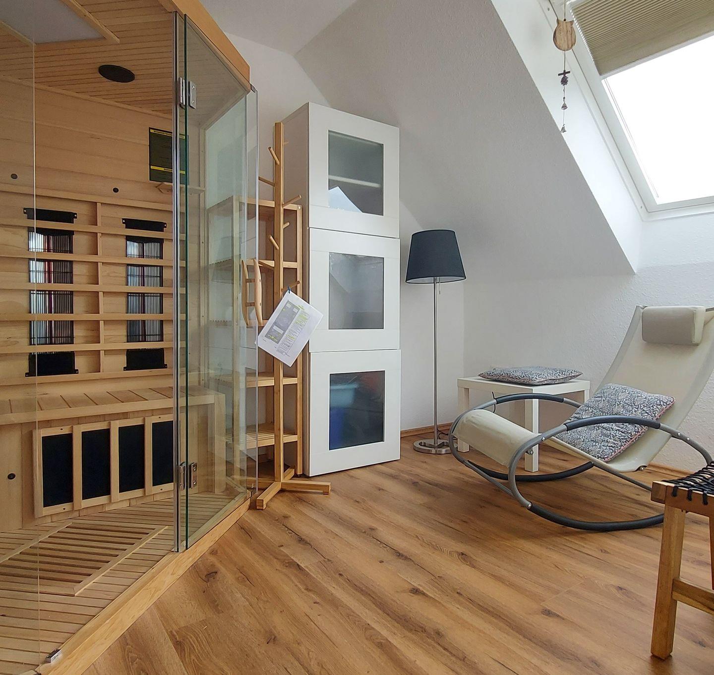 Die kleine Wellness-Oase im Raum nebenan lädt mit einer geräumigen Infrarot-Ecksauna für 2-4 Personen und Saunaliege ganzjährig zu Entspannung und Erholung ein. Die Infrarot-Sauna ist besonders schonend für den Kreislauf, die relativ niedrige Lufttemperatur von 30 bis 65 Grad Celsius ermöglicht längere Saunagänge von bis zu 30 Minuten. Die Infrarot-Kabine ist mit einem Multimediasystem und einem Touchscreendisplay ausgestattet und einfach zu bedienen. Sie bietet mit ihrer Farblicht- und Aromatherapie Genuss für die ganze Familie.