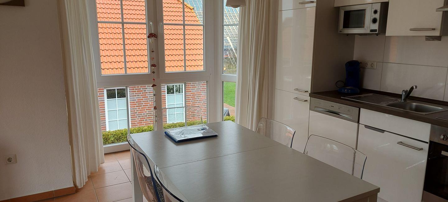 Die Einbau-Küche ist mit Geschirr und Kochutensilien komplett bestückt und verfügt über einen Kühlschrank mit Gefrierfach, Geschirrspüler, Umluft-Backofen, Cerankochfeld, Mikrowelle, Kaffeemaschine, Senseo-Padmaschine, Wasserkocher, Toaster.