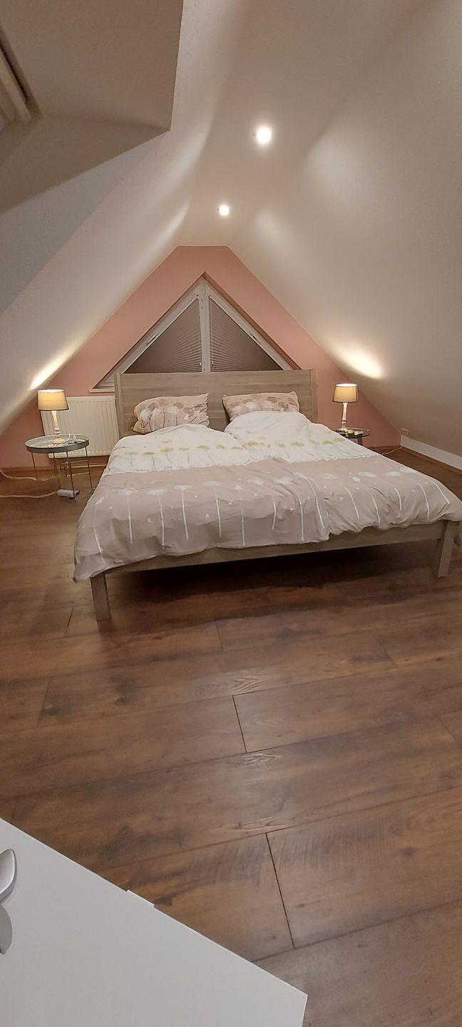 Ein zweites Schlafzimmer im Dachgeschoss ist ebenfalls mit einem Doppelbett mit verstellbaren Lattenrosten möbliert und durch blickdichte Plissees verdunkelbar. Der zur Treppe geschlossene atmosphärisch schöne Raum lädt mit einem zweiten Fernseher und Bücherauswahl zum Lesen und Relaxen ein.