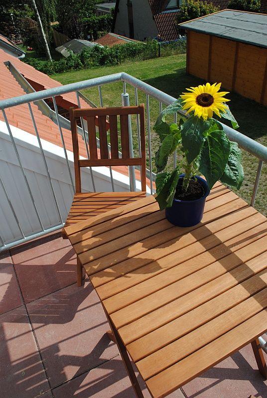 Für sonnige Tage ist der Balkon mit Mobiliar ausgestattet.