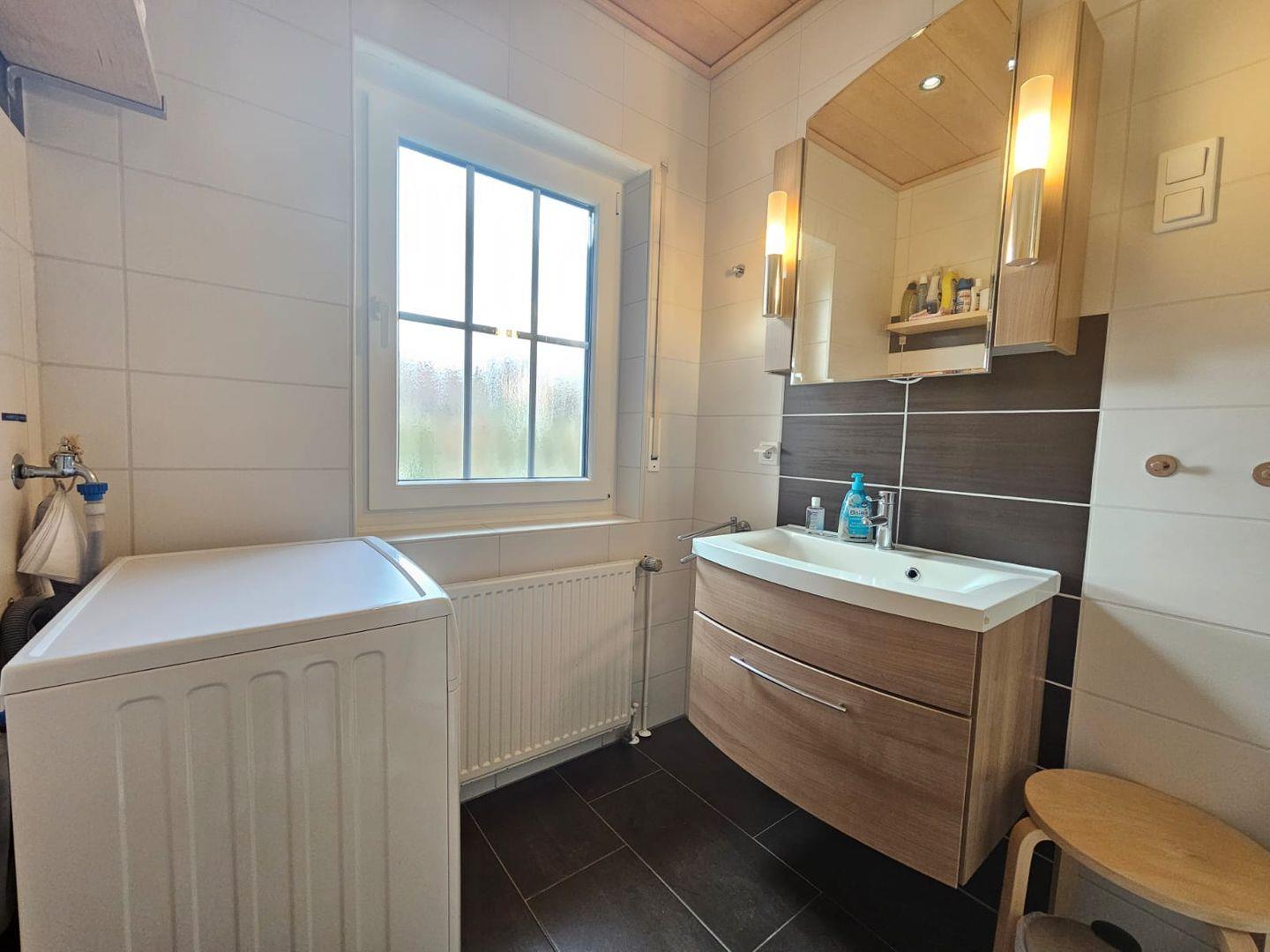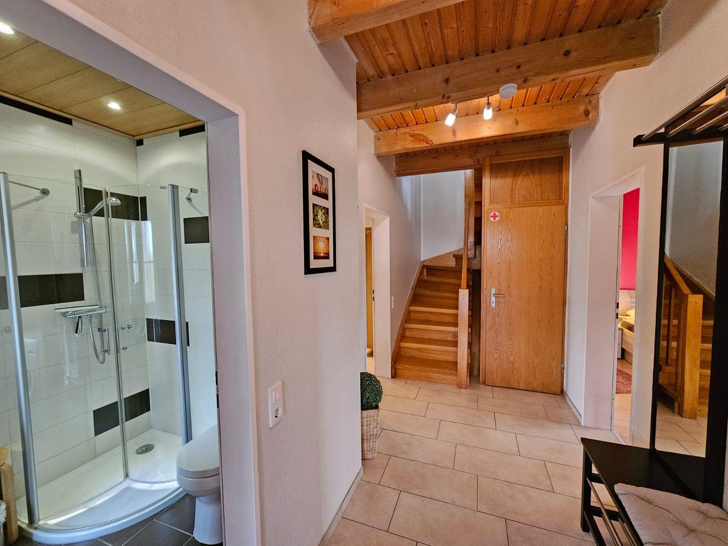 Erdgeschoss: Modernes Bad mit Dusche, WC und Waschmaschine.
