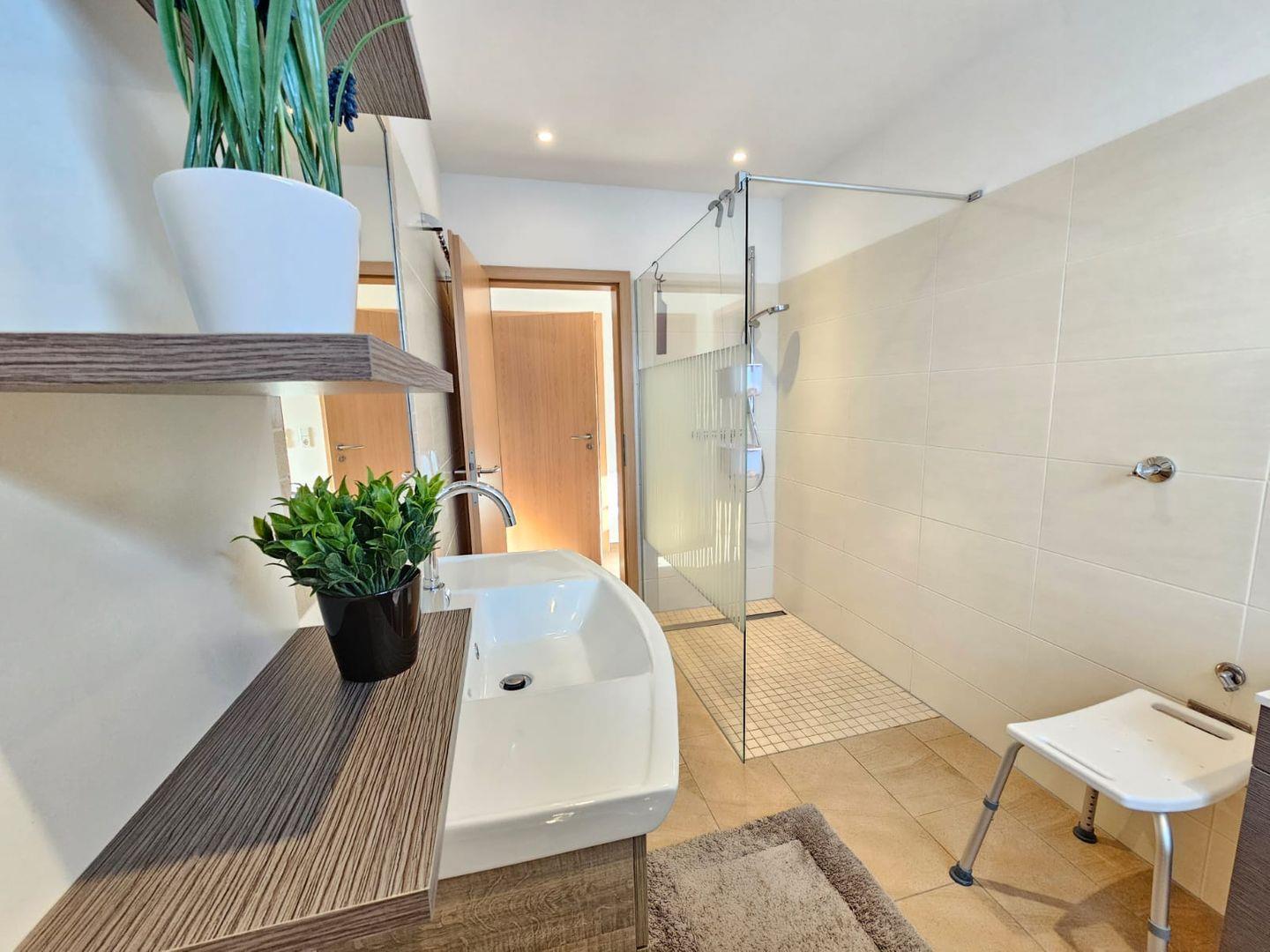 Modernes Badezimmer mit Dusche, Waschbecken und WC.