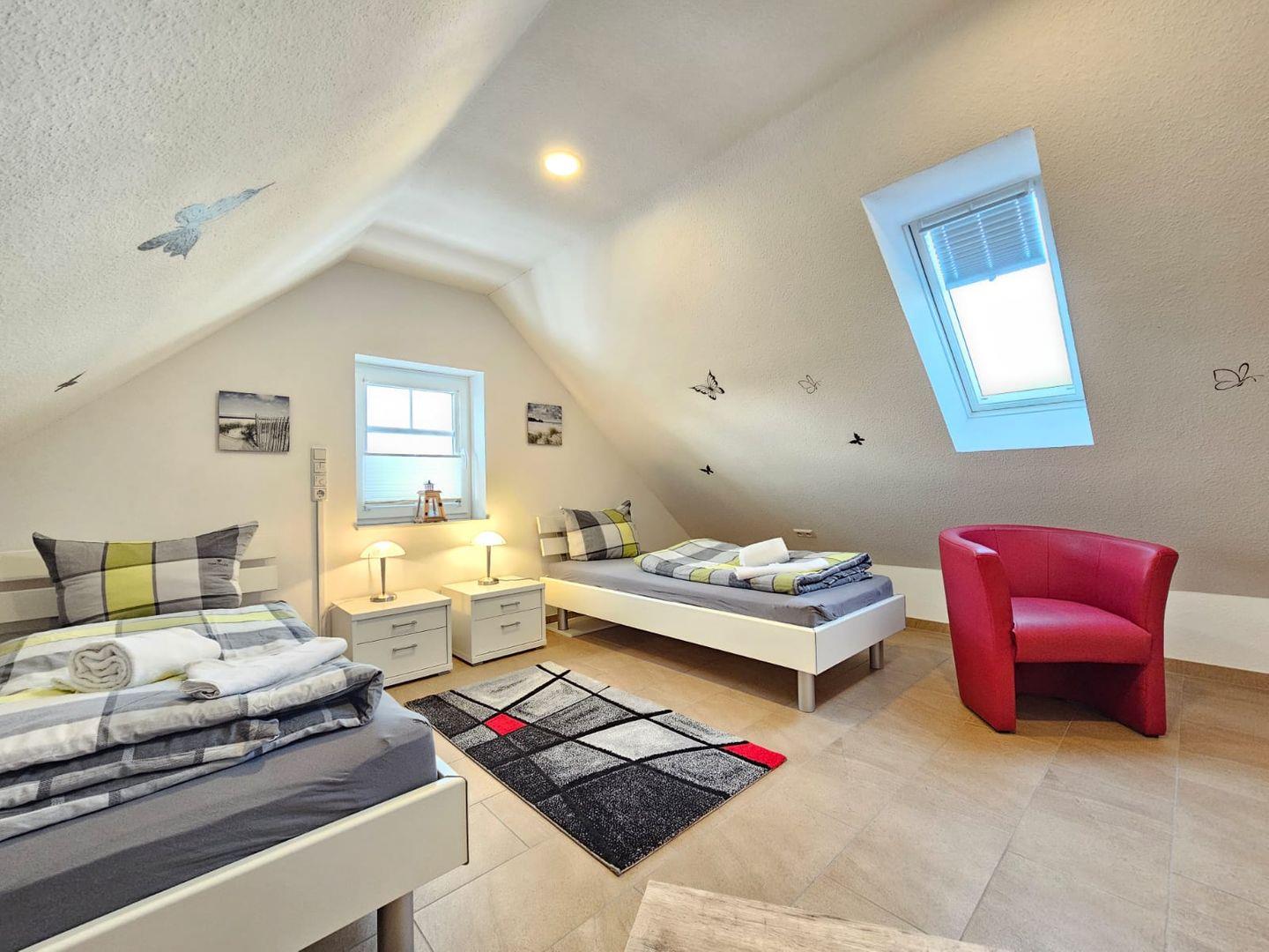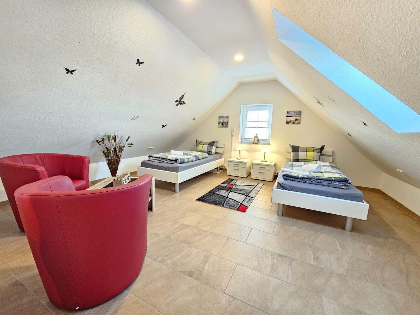 Schlafzimmer (Kinderzimmer): Zwei Einzelbetten, stilvoll eingerichtet und ideal für Kinder oder Jugendliche.