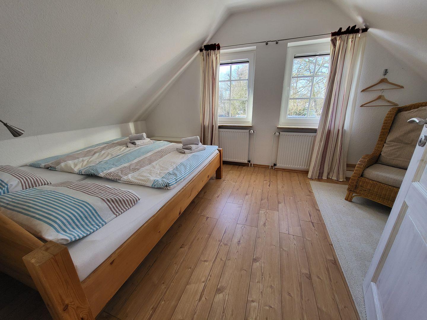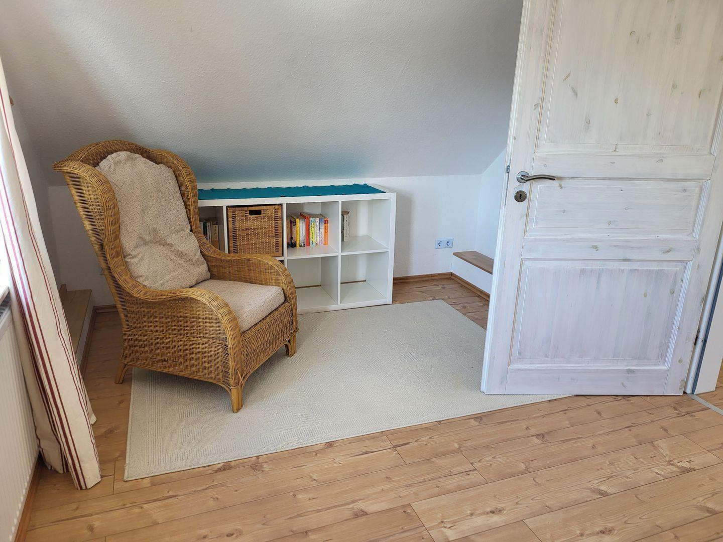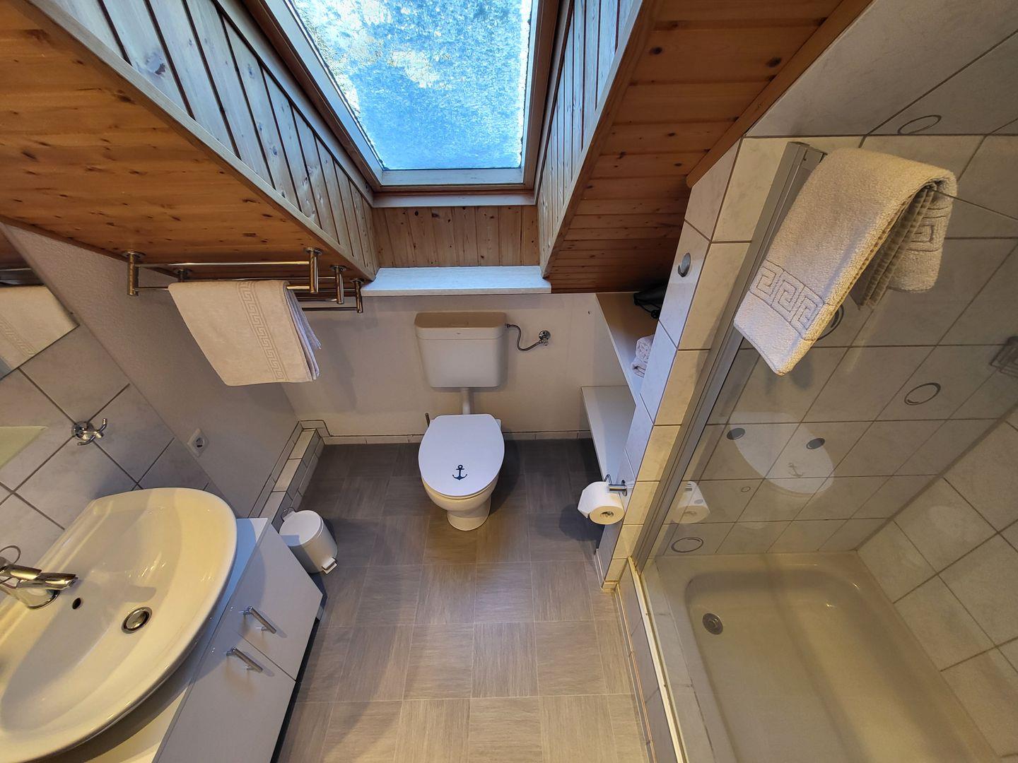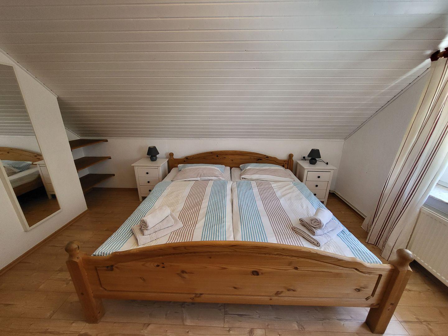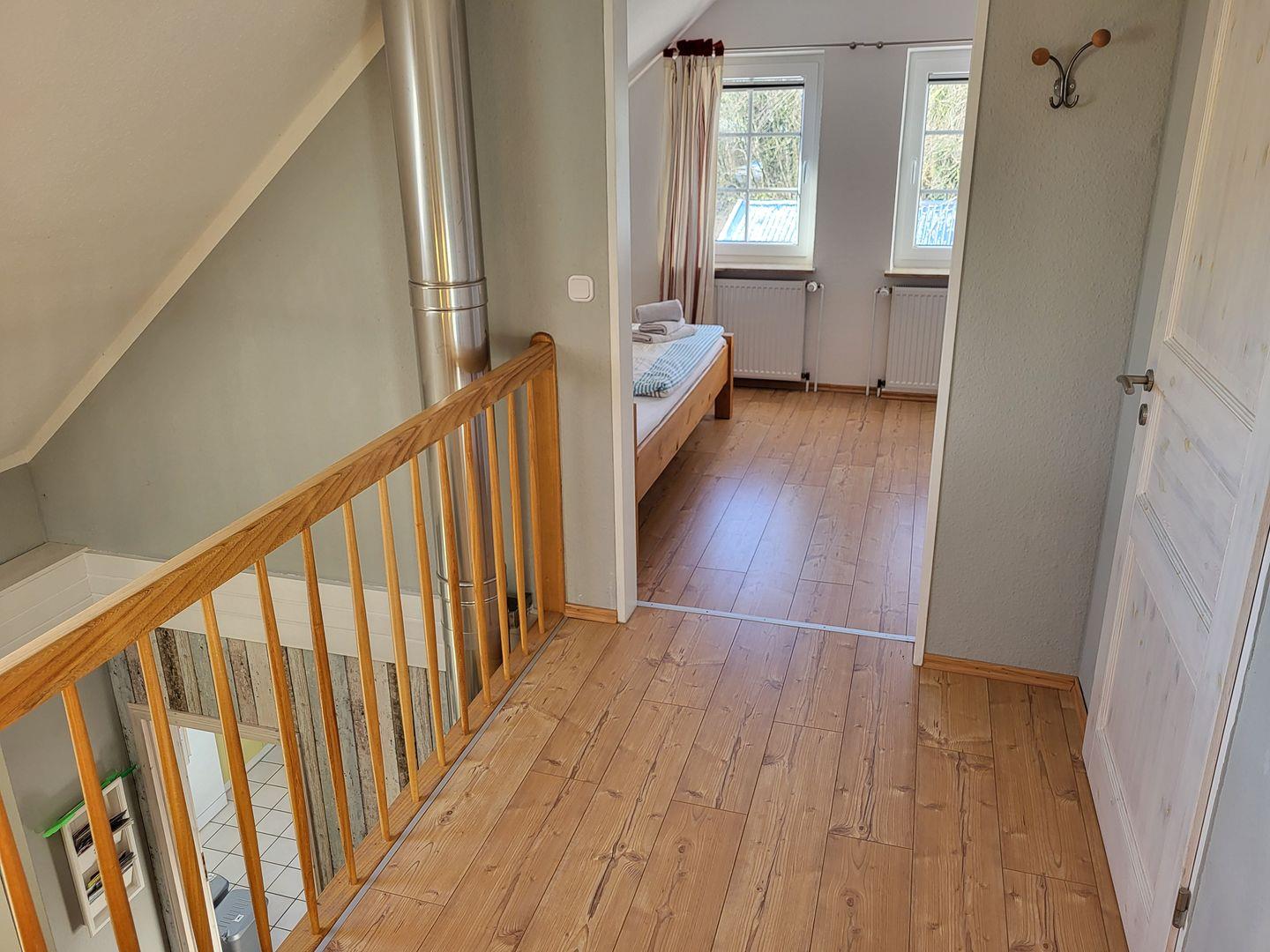 Über den seitlichen Eingang kommen Sie ins Haus, um unteren Bereich befindet sich eine gut ausgestattet Küche mit Essbereich, Ceranfeld, Kühlschrank, Waschmaschine, Geschirrspüler, Kaffeemaschine und weiteren Utensilien. Angrenzend dazu befindet sich der Wohnbereich mit einem Sofa, 3 Sessel und TV. Über die Treppe im Wohnbereich kommen Sie in Obergeschoß, hier befinden sich 3 Schlafzimmer und ein Bad mit Dusche.