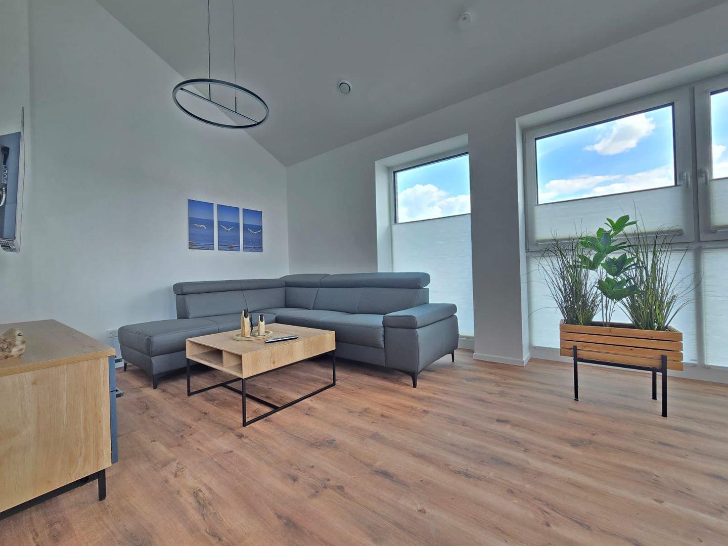 Die hell eingerichtete Ferienwohnung überzeugt durch ein modernes Wohnkonzept und hochwertige Ausstattung. Das großzügige Wohnzimmer bietet gemütliche Sitzgelegenheiten, einen Essbereich sowie eine moderne Küche mit hochwertigen Geräten, die das Kochen zum Vergnügen machen.