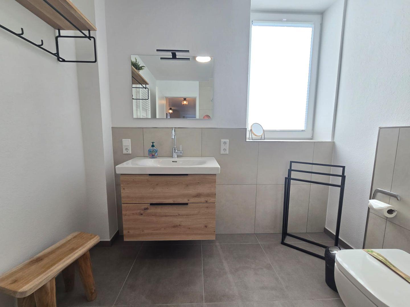 Das Badezimmer ist hell, gepflegt und zeitgemäß gestaltet. Hochwertige Materialien schaffen ein angenehmes Wohlfühlgefühl.