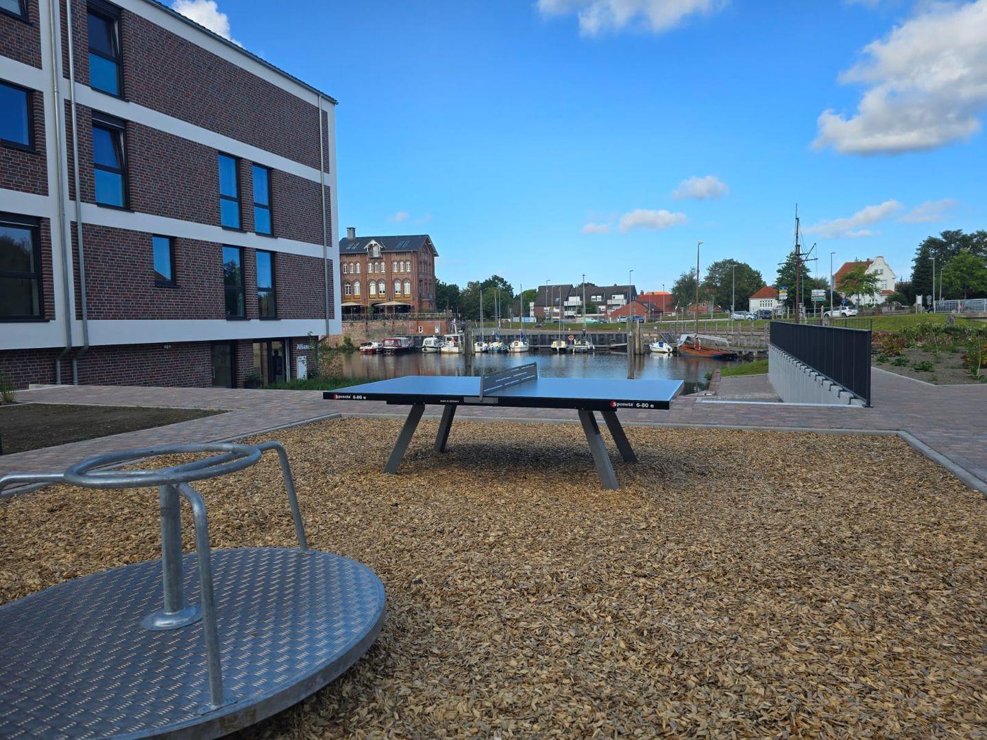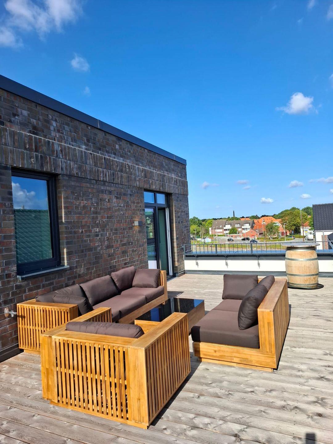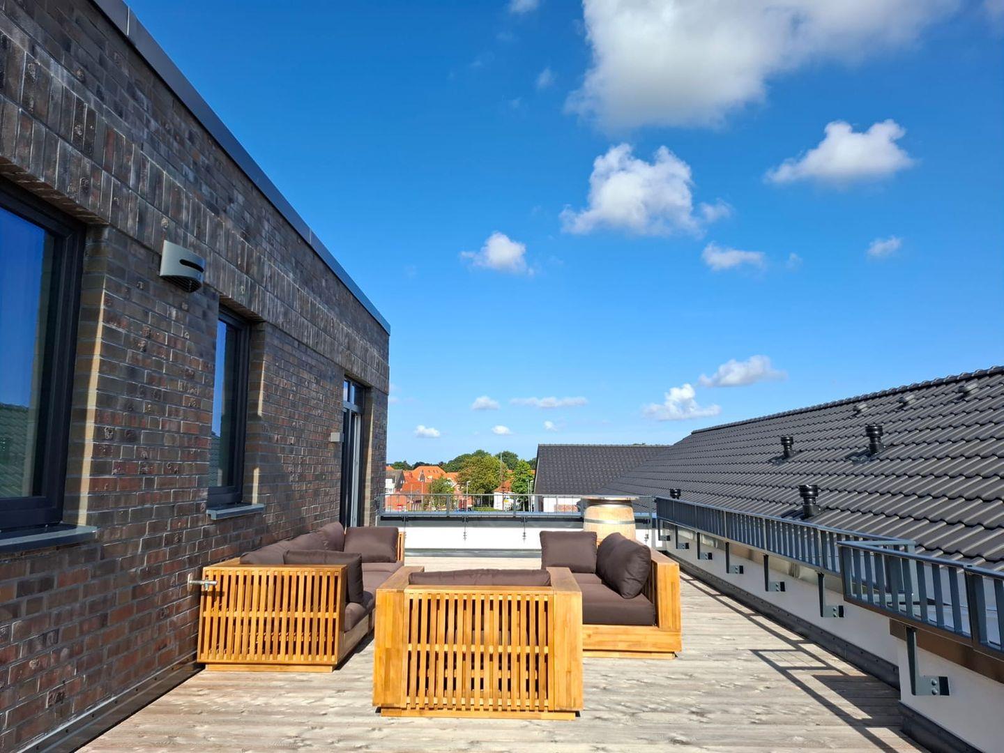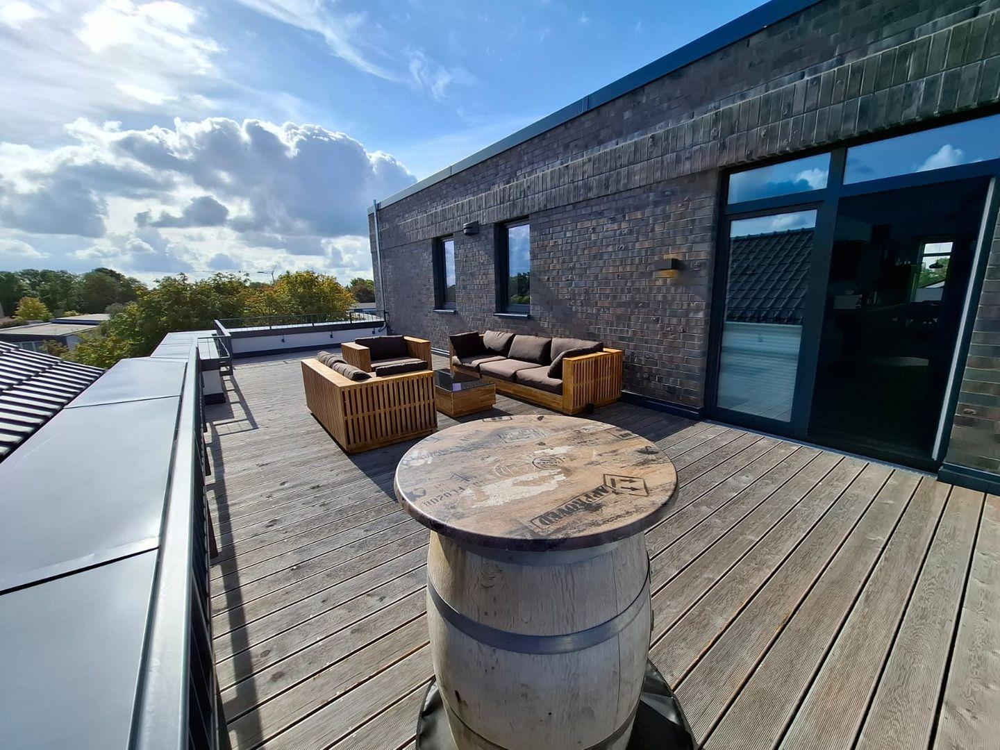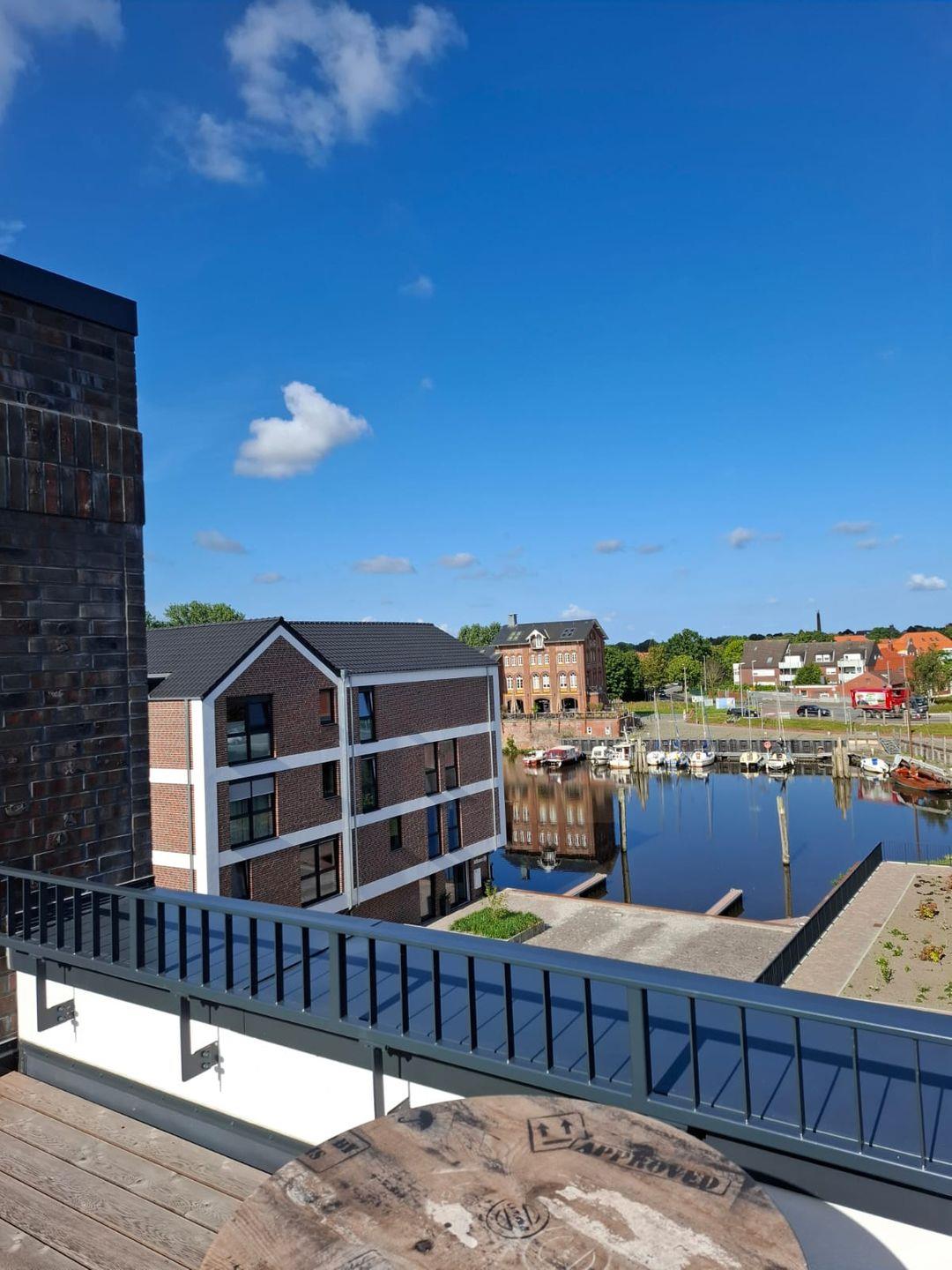 Ein absolutes Highlight ist die große Dachterrasse. Von hier aus genießen Sie einen traumhaften Blick über die Norder Marina. Ob beim Frühstück in der Morgensonne, beim Sonnenbaden oder am Abend mit einem gemütlichen Getränk, die Terrasse bietet den perfekten Rahmen für Ihre persönlichen Wohlfühlmomente.