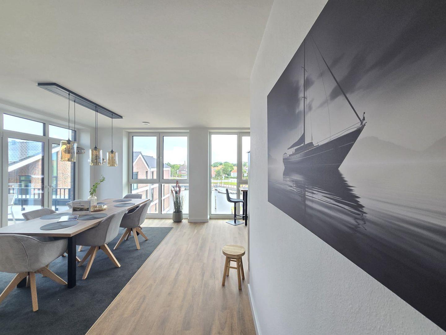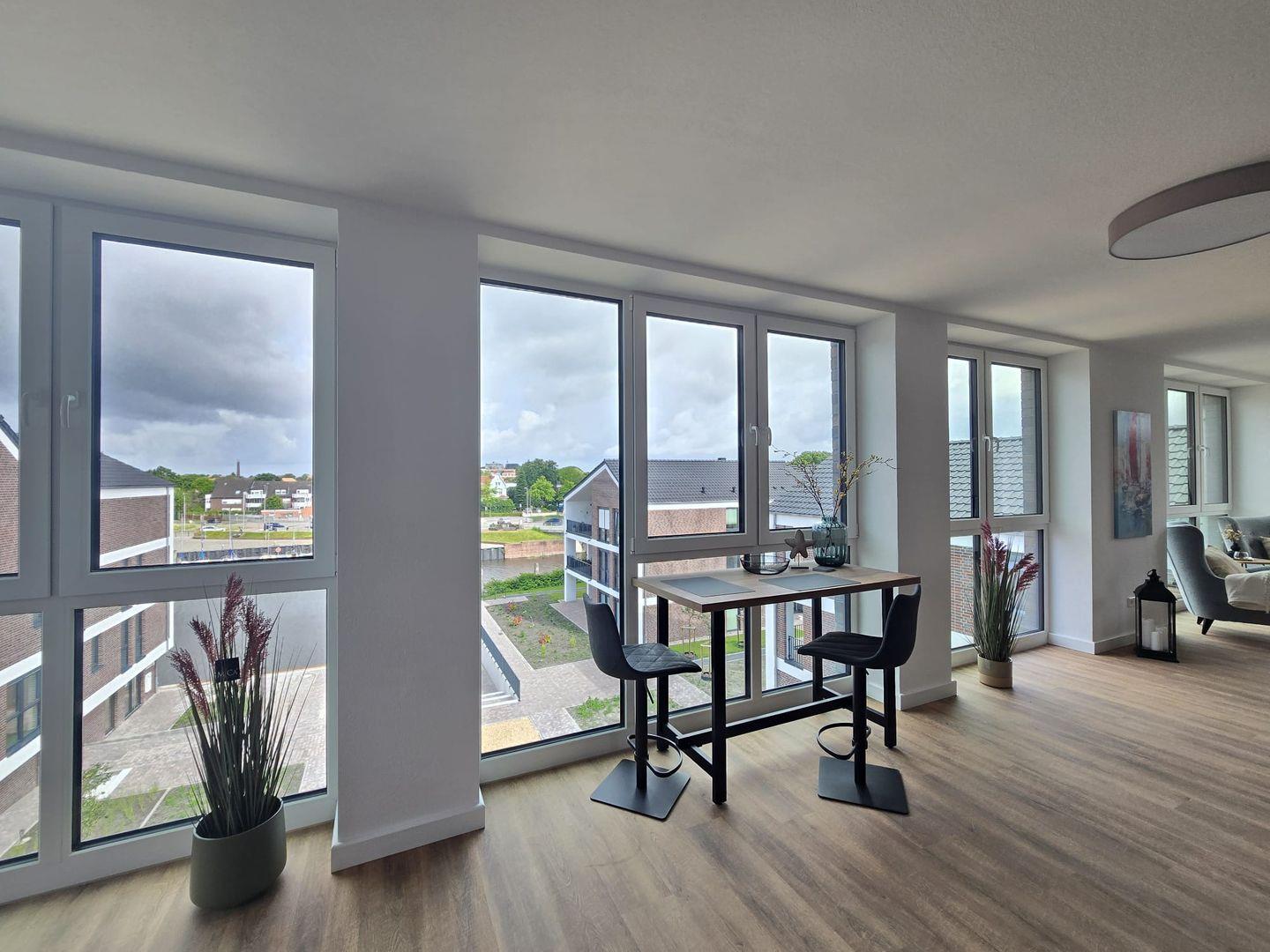 Das Penthouse überzeugt durch ein modernes Wohnkonzept und große Fensterfronten, die viel Licht hereinlassen und eine freundliche, offene Atmosphäre schaffen. Der elegant eingerichtete Wohnbereich lädt zu entspannten Stunden ein, sei es nach einem Strandtag, einem Ausflug an die Küste oder einem Spaziergang durch Norden.
