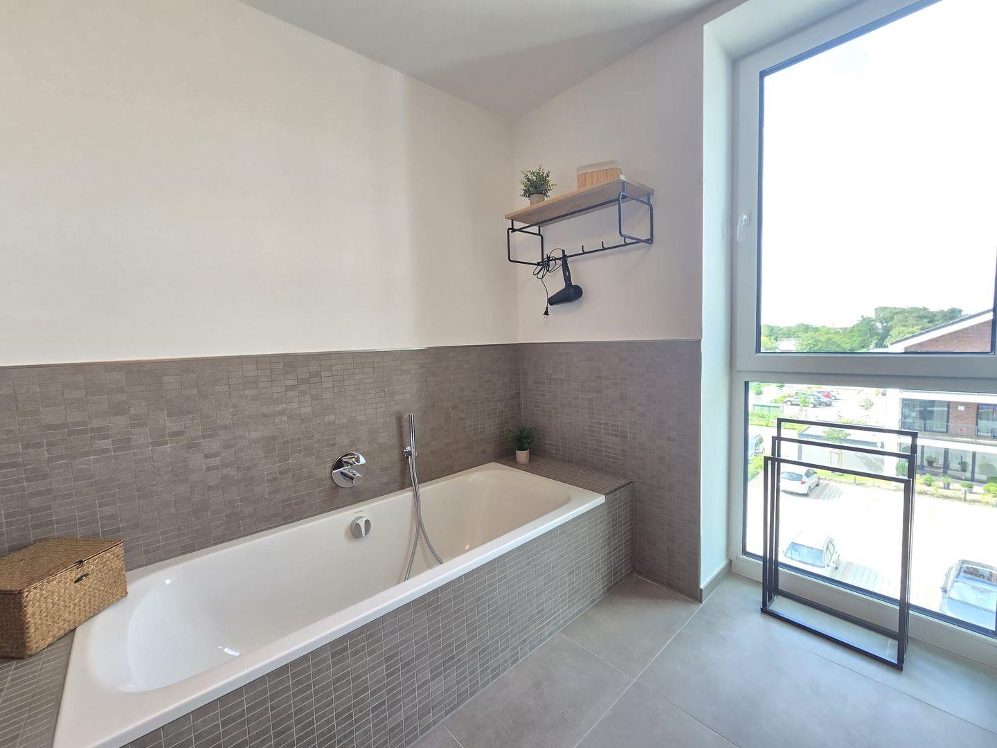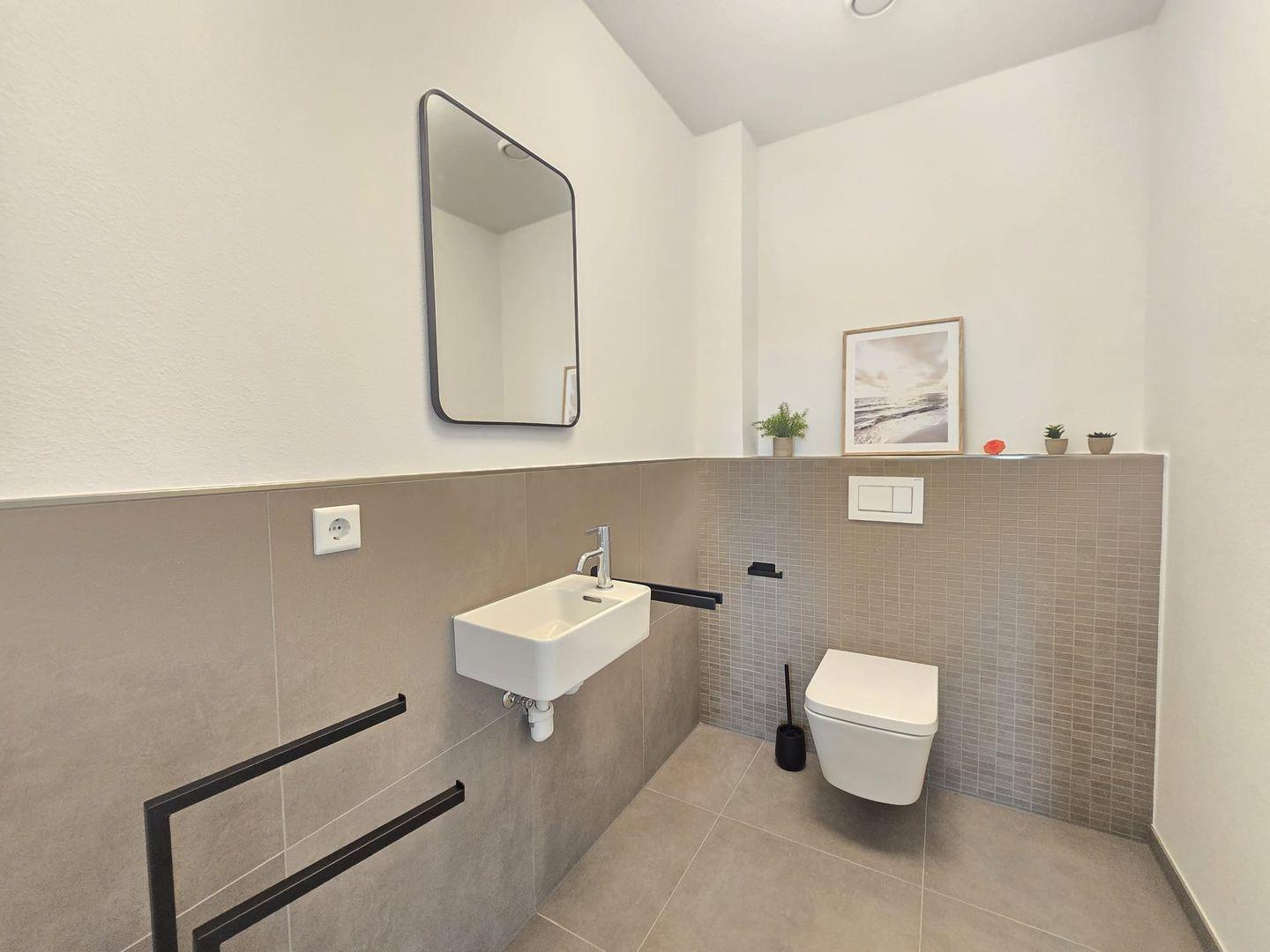 Das Badezimmer ist gepflegt, modern und großzügig gestaltet. Qualitätsmaterialien und eine klare Linienführung sorgen für ein angenehmes Ambiente.
