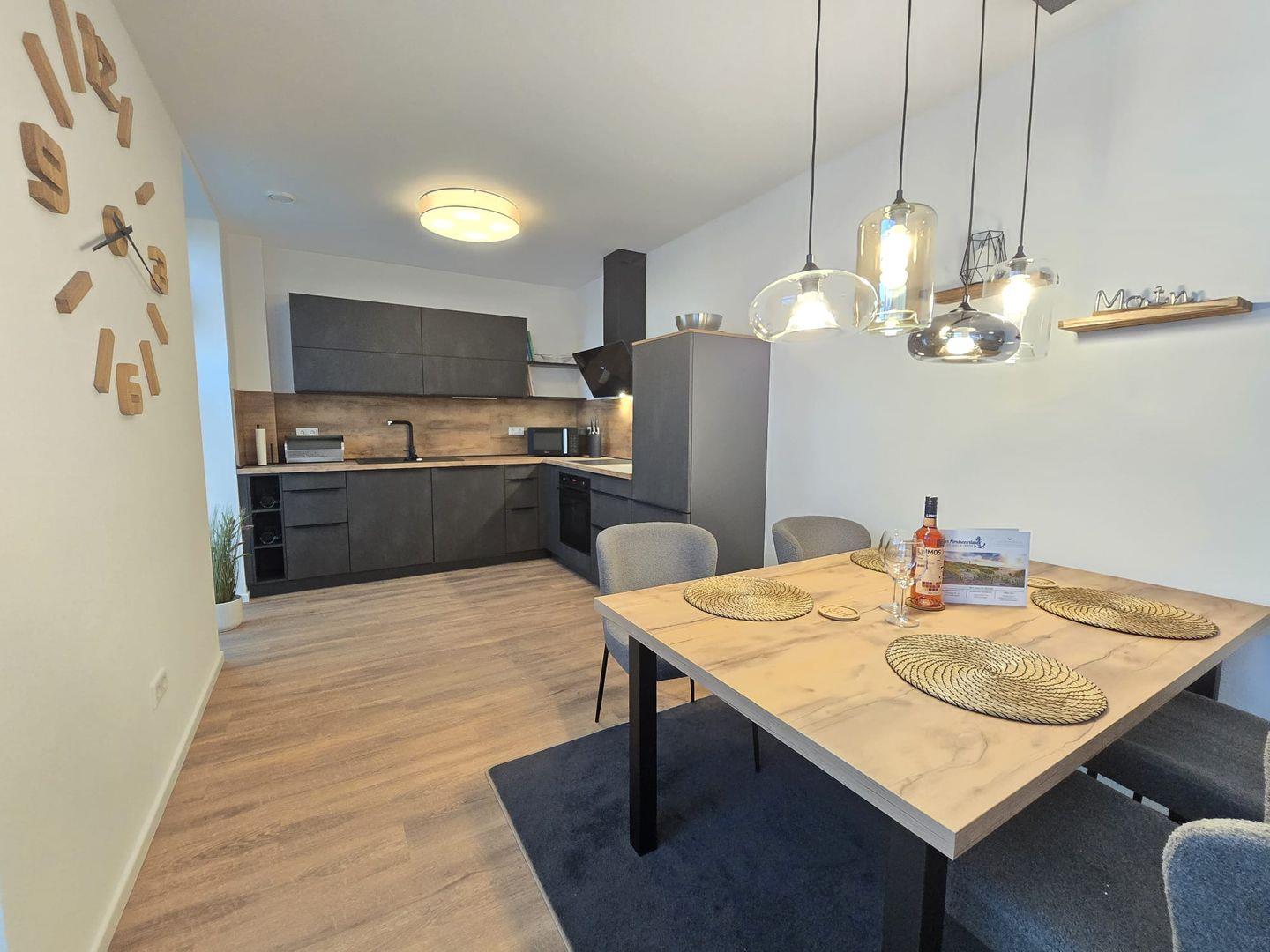 Die lichtdurchflutete Wohnung empfängt Sie mit großen Fensterfronten, die für eine helle und freundliche Atmosphäre sorgen. Der offen gestaltete Wohnbereich lädt mit gemütlichen Sitzmöbeln und moderner Ausstattung zum Entspannen ein. Hier können Sie nach einem Tag an der Nordsee zur Ruhe kommen und die besondere Wohlfühlatmosphäre genießen.