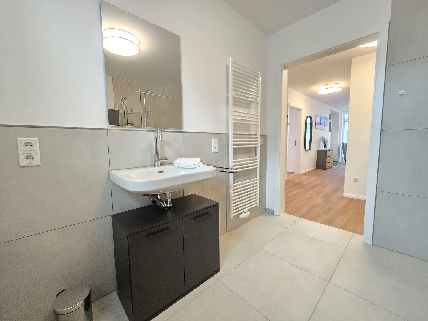 Das Badezimmer ist gepflegt und modern gestaltet. Die Kombination aus klaren Linien und hochwertigen Materialien erzeugt ein angenehmes Wellnessgefühl.