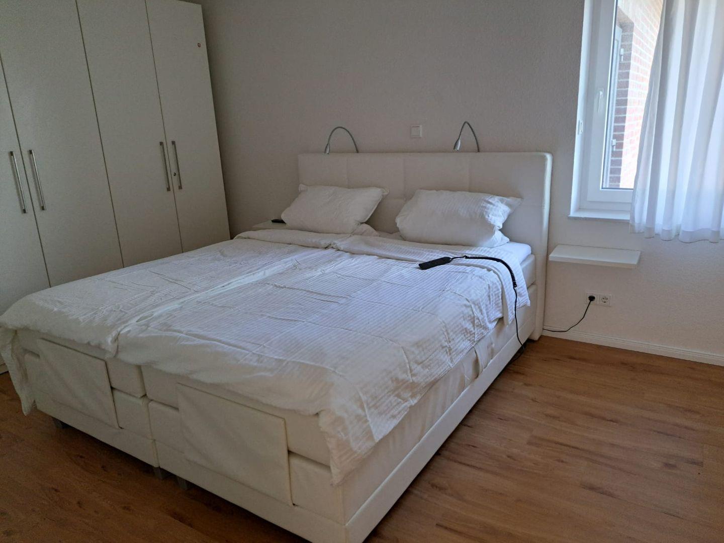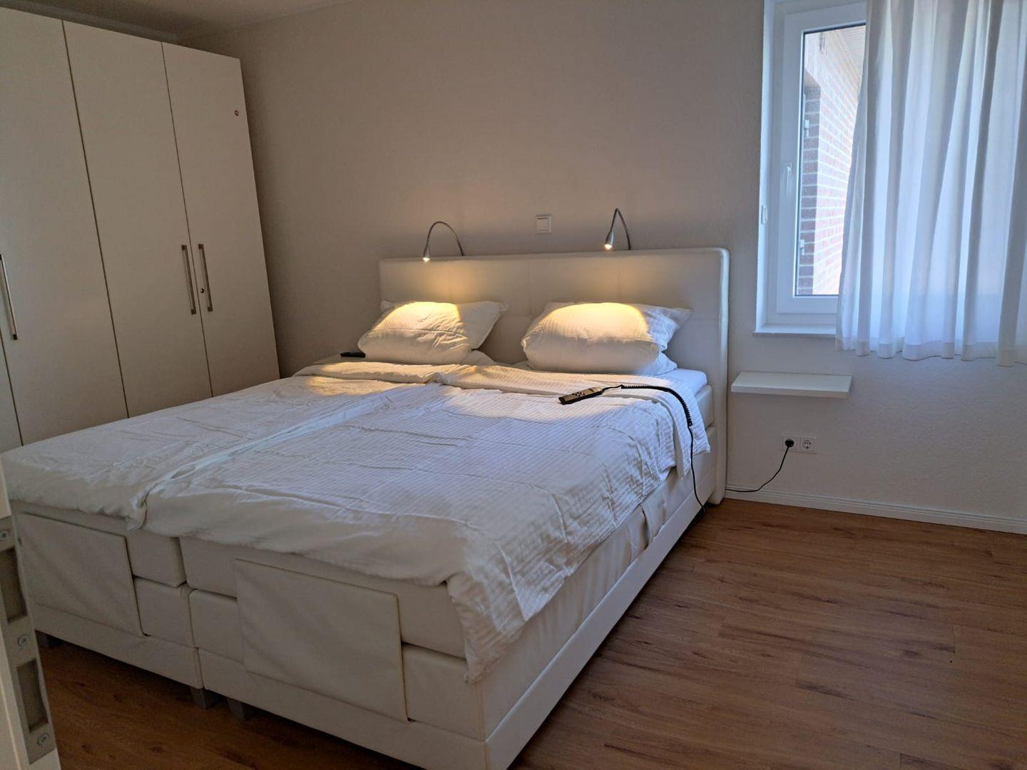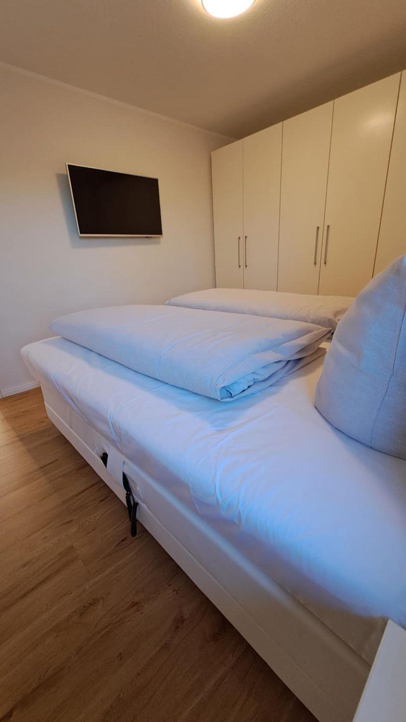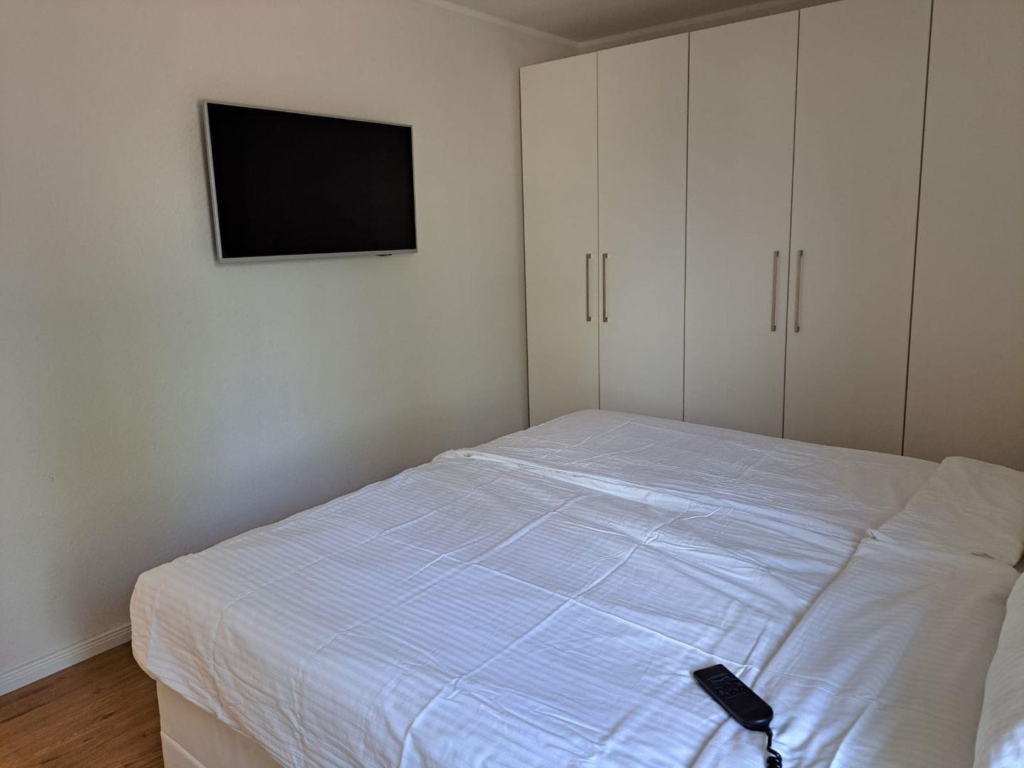 Hier erwartet Sie ein gemütliches Boxspring-Bett (180 x 200 cm), ein großer LED-TV und ein geräumiger Kleiderschrank mit Kleiderbügeln. Eine elektronisch steuerbare Fußbodenheizung und elektrische Außenjalousien sind ebenfalls vorhanden.