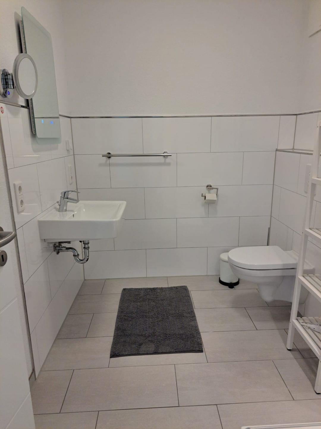 Bodenebene Dusche mit LED-Beleuchtung, Hänge-WC, Waschtischkombination inklusive Wandspiegel, Wandeinbauradio, elektronisch steuerbarer Fußbodenheizung bilden ein Wohlfühl-Ambiente. Ein Fön sowie ein Handtuchheizkörper sind ebenfalls vorhanden.
