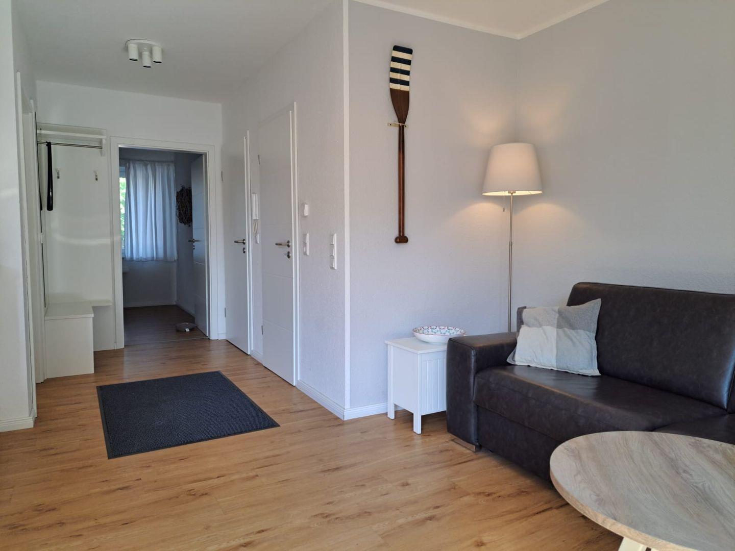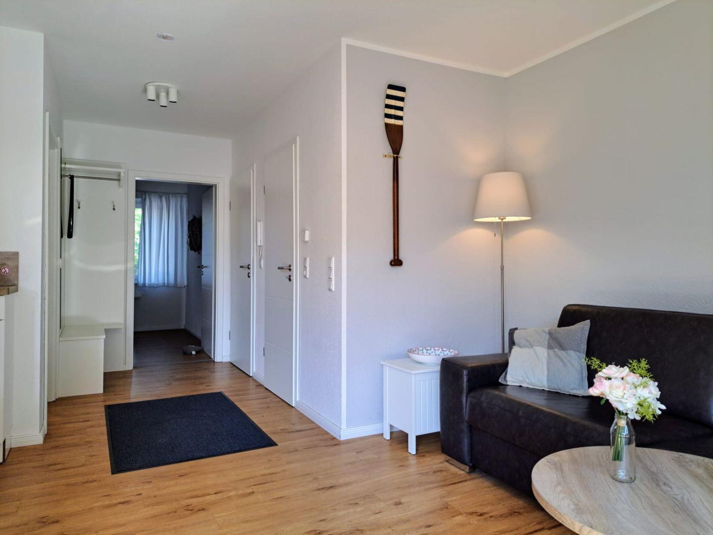 Die moderne 2-Raum-Ferienwohnung (ca. 55qm²) im Erdgeschoss verfügt über einen Wohn-/Schlafraum mit Essbereich und Küchenzeile, Schlafzimmer mit Doppelbett sowie Badezimmer mit Dusche/ WC. Zur Wohnung gehört eine geschützte Terrasse. Parkplatz direkt am Haus.